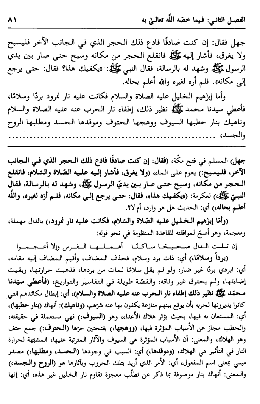 وأما إبراهيم الخليل عليه الصلاة والسلام فكانت عليه نار نمرود بردًا وسلامًا، فأعطي سيدنا محمد صلى الله عليه وسلم نظير ذلك، إطفاء نار الحرب عنه عليه الصلاة والسلام وناهيك بنار حطبها السيوف ووهجها الحتوف وموقدها الجسد ومطلبها الروح والجسد.