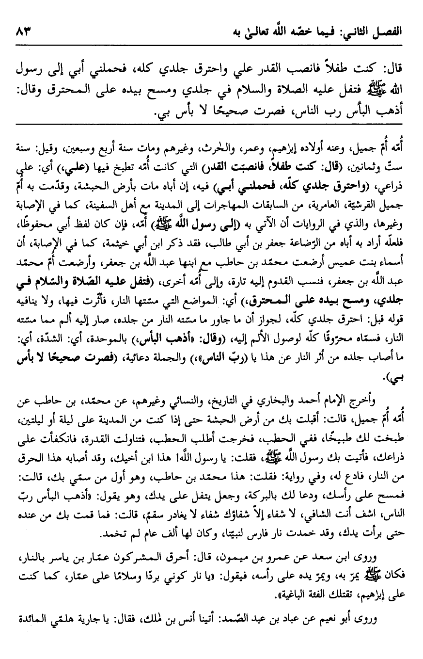 قال: كنت طفلا فانصب القدر علي واحترق جلدي كله، فحملني أبي إلى رسول الله صلى الله عليه وسلم فتفل عليه الصلاة والسلام في جلدي ومسح بيده على المحترق وقال: "أذهب البأس رب الناس"، فصرت صحيحًا لا بأس بي.