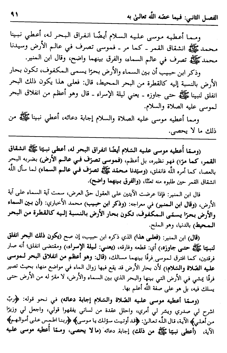"ومما أعطيه موسى عليه السلام أيضًا انفراق البحر له، أعطي نبينا صلى الله عليه وسلم انشقاق القمر، كما مر" فهو نظيره، بل أعظم، "فموسى تصرف في عالم الأرض" بضربه البحر بالعصا، كما أمره الله فانفلق، "وسيدنا محمد صلى الله عليه وسلم تصرف في عالم السماء" لما سأل الله انشقاق القمر حين طلبوه منه تعنتًا، "والفرق بينهما واضح".