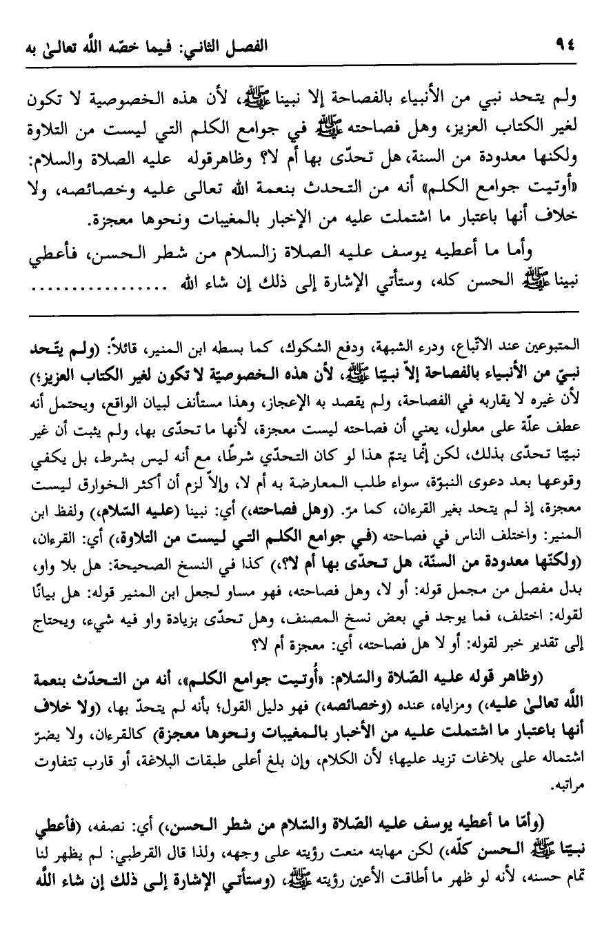 ولم يتحد نبي من الأنبياء بالفصاحة إلا نبينا صلى الله عليه وسلم، لأن هذه الخصوصية لا تكون لغير الكتاب العزيز، وهل فصاحته صلى الله عليه وسلم في جوامع الكلم التي ليست من التلاوة ولكنها معدودة من السنة، هل تحدى بها أم لا؟ وظاهر قوله عليه الصلاة والسلام: "أوتيت جوامع الكلم" أنه من التحدث بنعمة الله تعالى عليه وخصائصه، ولا خلاف أنها باعتبار ما اشتملت عليه من الإخبار بالمغيبات ونحوها معجزة.