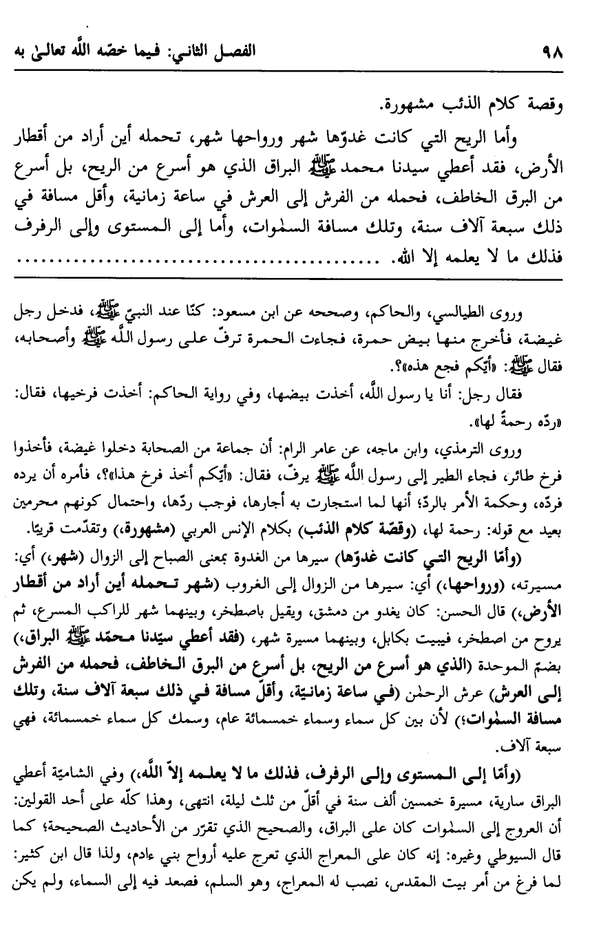 وأما الريح التي كانت غدوها شهر ورواحها شهر، تحمله أين أراد من أقطار الأرض، فد أعطي سيدنا محمد صلى الله عليه وسلم البراق الذي هو أسرع من الريح، بل أسرع من البرق الخاطف، فحمله من الفرش إلى العرش في ساعة زمانية، وأقل مسافة في ذلك سبعة آلاف سنة، وتلك مسافة السماوات، وأما إلى المستوى وإلى الرفرف فذلك ما لا يعلمه إلا الله.