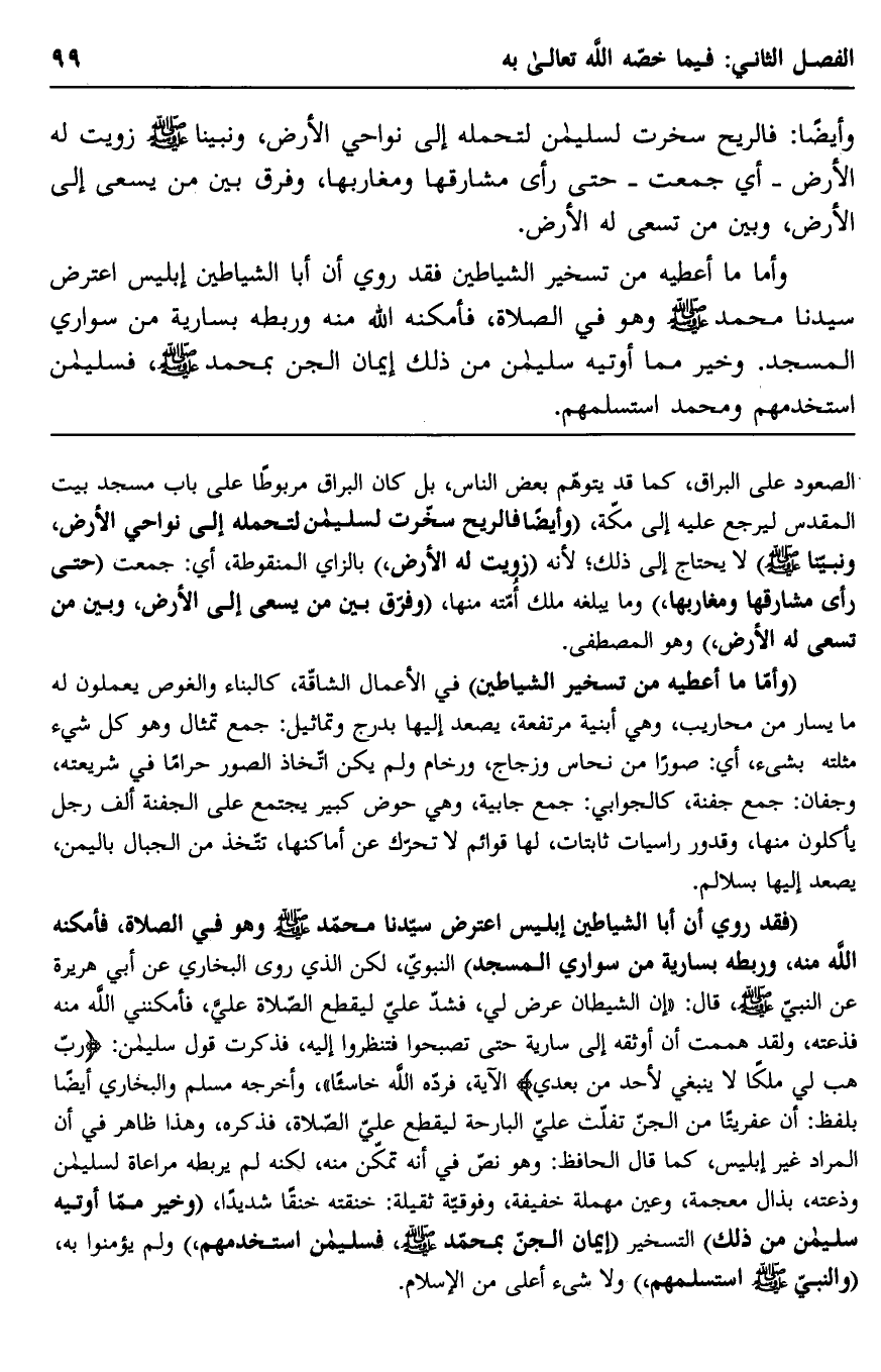 "فقد روي أن أبا الشياطين إبليس اعترض سيدنا محمد صلى الله عليه وسلم وهو في الصلاة، فأمكنه الله منه، وربطه بسارية من سواري المسجد" النبوي، لكن الذي روى البخاري عن أبي هريرة عن النبي صلى الله عليه وسلم، قال: "إن الشيطان عرض لي، فشد عليّ ليقطع الصلاة عليّ، فأمكنني الله منه فذعته، ولقد هممت أن أوثقه إلى سارية حتى تصبحوا فتنظروا إليه، فذكرت قول سليمان: {رَبِّ اغْفِرْ لِي وَهَبْ لِي مُلْكًا لا يَنْبَغِي لأَحَدٍ مِنْ بَعْدِي} الآية، فرده الله خاسئًا"، وأخرجه مسلم والبخاري أيضًا بلفظ: "إن عفريتا من الجن تفلَّت عليّ البارحة ليقطع عليّ الصلاة"، فذكره، وهذا ظاهر في أن المراد غير إبليس، كما قال الحافظ: وهو نص في أنه تمكن منه، لكنه لم يربطه مراعاة لسليمان, وذعته بذال معجمة، وعين مهملة خفيفة، وفوقية ثقيلة: خنقته خنقًا شديدًا، "وخير مما أوتيه سليمان من ذلك" التسخير "إيمان الجن بمحمد صلى الله عليه وسلم، فسليمان استخدمه" ولم يؤمنوا به، "والنبي صلى الله عليه وسلم استسلمهم" ولا شيء أعلى من الإسلام.