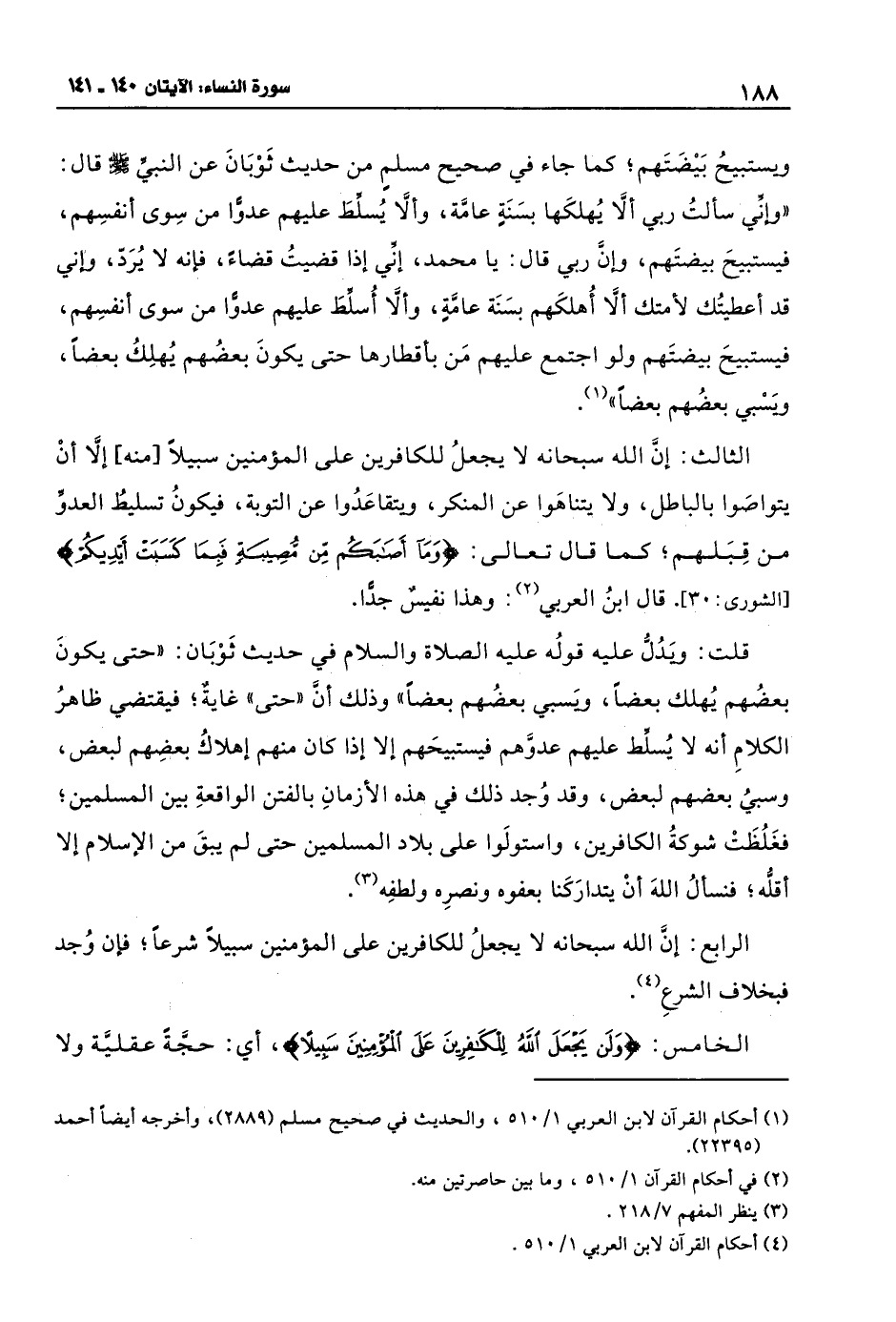 قَوْلُهُ تَعَالَى: (قُلْ أَمَرَ رَبِّي بِالْقِسْطِ) قَالَ ابْنُ عَبَّاسٍ: لَا إِلَهَ إِلَّا اللَّهُ. وَقِيلَ: القسط العدل، أي أمر: العدل فَأَطِيعُوهُ. فَفِي الْكَلَامِ حَذْفٌ. (وَأَقِيمُوا وُجُوهَكُمْ) أَيْ تَوَجَّهُوا إِلَيْهِ فِي كُلِّ صَلَاةٍ إِلَى الْقِبْلَةِ. (عِنْدَ كُلِّ مَسْجِدٍ) أَيْ فِي أَيِّ مَسْجِدٍ كُنْتُمْ. (وَادْعُوهُ مُخْلِصِينَ لَهُ) الدِّينَ أَيْ وَحِّدُوهُ وَلَا تُشْرِكُوا بِهِ. (كَما بَدَأَكُمْ تَعُودُونَ) نَظِيرُهُ" وَلَقَدْ جِئْتُمُونا فُرادى كَما خَلَقْناكُمْ أَوَّلَ مَرَّةٍ «1» " وَقَدْ تَقَدَّمَ. وَالْكَافُ فِي مَوْضِعِ نَصْبٍ، أَيْ تَعُودُونَ كَمَا بَدَأَكُمْ، أَيْ كَمَا خَلَقَكُمْ أَوَّلَ مَرَّةٍ يُعِيدُكُمْ. وَقَالَ الزَّجَّاجُ: هُوَ مُتَعَلِّقٌ بِمَا قَبْلَهُ. أَيْ وَمِنْهَا تُخْرَجُونَ كَمَا بَدَأَكُمْ تَعُودُونَ. (فَرِيقاً هَدى) " فَرِيقاً" نُصِبَ عَلَى الْحَالِ مِنَ الْمُضْمَرِ فِي" تَعُودُونَ" أَيْ تَعُودُونَ فَرِيقَيْنِ: سُعَدَاءَ، وَأَشْقِيَاءَ. يُقَوِّي هَذَا قِرَاءَةُ أُبَيٍّ" تَعُودُونَ فَرِيقَيْنِ فَرِيقًا هَدَى وَفَرِيقًا حَقَّ عَلَيْهِمُ الضَّلَالَةُ"، عَنِ الْكِسَائِيِّ. وَقَالَ مُحَمَّدُ بْنُ «2» كَعْبٍ الْقُرَظِيُّ فِي قَوْلِهِ تَعَالَى" فَرِيقاً هَدى وَفَرِيقاً حَقَّ عَلَيْهِمُ الضَّلالَةُ" قَالَ: مَنِ ابْتَدَأَ اللَّهُ خَلْقَهُ لِلضَّلَالَةِ صَيَّرَهُ إِلَى الضَّلَالَةِ، وَإِنْ عَمِلَ بِأَعْمَالِ الْهُدَى. وَمَنِ ابْتَدَأَ اللَّهَ خَلْقَهُ عَلَى الْهُدَى صَيَّرَهُ إِلَى الْهُدَى، وَإِنْ عَمِلَ بِأَعْمَالِ الضَّلَالَةِ. ابْتَدَأَ اللَّهُ خَلْقَ إِبْلِيسَ عَلَى الضَّلَالَةِ، وَعَمِلَ بِأَعْمَالِ السَّعَادَةِ مَعَ الْمَلَائِكَةِ، ثُمَّ رَدَّهُ اللَّهُ إِلَى مَا ابْتَدَأَ عَلَيْهِ خَلْقَهُ. قَالَ:" وَكانَ مِنَ الْكافِرِينَ" وَفِي هَذَا رَدٌّ وَاضِحٌ عَلَى الْقَدَرِيَّةِ وَمَنْ تَابِعْهُمْ. وَقِيلَ:" فَرِيقاً" نُصِبَ بِ" هَدى "،" وَفَرِيقاً" الثَّانِي نُصِبَ بِإِضْمَارِ فِعْلٍ، أَيْ وَأَضَلَّ فَرِيقًا. وَأَنْشَدَ سِيبَوَيْهِ: