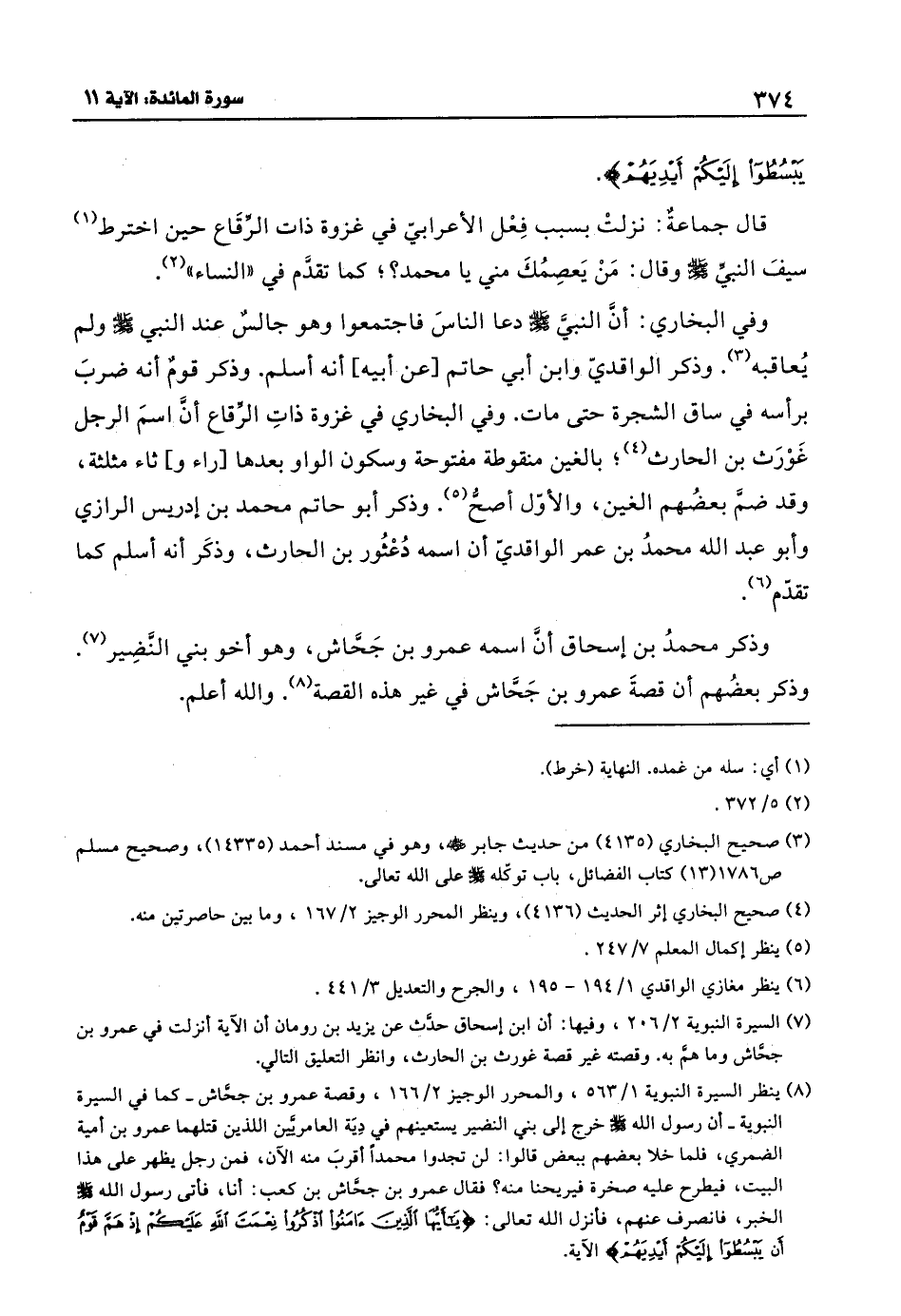 يَسْتَنْفِرُهُمْ إِلَى أَمْوَالِهِمْ وَيُخْبِرُهُمْ أَنَّ مُحَمَّدًا صَلَّى اللَّهُ عَلَيْهِ وَسَلَّمَ قَدْ عَرَضَ لَهَا فِي أَصْحَابِهِ، فَفَعَلَ ضَمْضَمُ. فَخَرَجَ أَهْلُ مَكَّةَ فِي أَلْفِ رَجُلٍ أَوْ نَحْوَ ذَلِكَ، وَخَرَجَ النَّبِيُّ صَلَّى اللَّهُ عَلَيْهِ وَسَلَّمَ فِي أَصْحَابِهِ، وَأَتَاهُ الْخَبَرُ عَنْ قُرَيْشٍ بِخُرُوجِهِمْ لِيَمْنَعُوا عِيرَهُمْ، فَاسْتَشَارَ النَّبِيُّ صَلَّى اللَّهُ عَلَيْهِ وَسَلَّمَ النَّاسَ، فَقَامَ أَبُو بَكْرٍ فَقَالَ فَأَحْسَنَ، وَقَامَ عُمَرُ فَقَالَ فَأَحْسَنَ، ثُمَّ قَامَ الْمِقْدَادُ بْنُ عَمْرٍو فَقَالَ: يَا رَسُولَ اللَّهِ، امْضِ لِمَا أَمَرَكَ اللَّهُ فَنَحْنُ مَعَكَ، وَاللَّهِ لَا نَقُولُ كَمَا قَالَتْ بَنُو إِسْرَائِيلَ" فَاذْهَبْ أَنْتَ وَرَبُّكَ فَقاتِلا إِنَّا هاهُنا قاعِدُونَ" وَلَكِنِ اذْهَبْ أَنْتَ وَرَبُّكَ فَقَاتِلَا إِنَّا مَعَكُمْ مُقَاتِلُونَ، وَالَّذِي بَعَثَكَ بِالْحَقِّ لَوْ سِرْتَ إِلَى بَرْكِ الْغِمَادِ- يَعْنِي مَدِينَةَ الْحَبَشَةِ- لَجَالَدْنَا مَعَكَ مِنْ دُونِهِ «1»، فَسُرَّ بِذَلِكَ رَسُولُ اللَّهِ صَلَّى اللَّهُ عَلَيْهِ وَسَلَّمَ وَدَعَا لَهُ بِخَيْرٍ. ثُمَّ قَالَ:" أَشِيرُوا عَلَيَّ أَيُّهَا النَّاسُ" يُرِيدُ الْأَنْصَارَ. وَذَلِكَ أَنَّهُمْ عَدَدُ النَّاسِ، وَكَانُوا حِينَ بَايَعُوهُ بِالْعَقَبَةِ قَالُوا: يَا رَسُولَ اللَّهِ، إِنَّا بُرَآءُ مِنْ ذِمَامِكَ حَتَّى تَصِلَ إِلَى دِيَارِنَا، فَإِذَا وَصَلْتَ إِلَيْنَا فَأَنْتَ فِي ذِمَمِنَا، نَمْنَعُكَ مِمَّا نَمْنَعُ مِنْهُ أَنْفُسَنَا وَأَبْنَاءَنَا وَنِسَاءَنَا. فَكَانَ رَسُولُ اللَّهِ صَلَّى اللَّهُ عَلَيْهِ وَسَلَّمَ يَتَخَوَّفُ أَلَّا تَكُونَ الْأَنْصَارُ تَرَى أَنَّ عَلَيْهَا نُصْرَتَهُ إِلَّا بِالْمَدِينَةِ، وَأَنَّهُ لَيْسَ عَلَيْهِمْ أَنْ يَسِيرَ بِهِمْ إِلَى عَدُوٍّ بِغَيْرِ بِلَادِهِمْ. فَلَمَّا قَالَ ذَلِكَ رَسُولُ اللَّهِ صَلَّى اللَّهُ عَلَيْهِ وَسَلَّمَ كَلِمَةُ سَعْدُ بْنُ مُعَاذٍ- وَقِيلَ سَعْدُ بْنُ عُبَادَةَ، وَيُمْكِنُ أَنَّهُمَا تَكَلَّمَا جَمِيعًا فِي ذَلِكَ الْيَوْمِ- فَقَالَ: يَا رَسُولَ اللَّهِ، كَأَنَّكَ تُرِيدُنَا مَعْشَرَ الْأَنْصَارِ؟ فَقَالَ رَسُولُ اللَّهِ صَلَّى اللَّهُ عَلَيْهِ وَسَلَّمَ: (أَجَلْ) فَقَالَ: إِنَّا قَدْ آمَنَّا بِكَ وَاتَّبَعْنَاكَ، فَامْضِ لِمَا أَمَرَكَ اللَّهُ، فَوَالَّذِي بَعَثَكَ بِالْحَقِّ لَوِ اسْتَعْرَضْتَ بِنَا هَذَا الْبَحْرَ فَخُضْتَهُ لَخُضْنَاهُ مَعَكَ. فَقَالَ رَسُولُ اللَّهِ صَلَّى اللَّهُ عَلَيْهِ وَسَلَّمَ:" امْضُوا عَلَى بَرَكَةِ اللَّهِ فَكَأَنِّي أَنْظُرُ إِلَى مَصَارِعِ الْقَوْمِ". فَمَضَى رَسُولُ اللَّهِ صَلَّى اللَّهُ عَلَيْهِ وَسَلَّمَ وَسَبَقَ قُرَيْشًا إِلَى مَاءِ بَدْرٍ. وَمَنَعَ قُرَيْشًا مِنَ السَّبَقِ إِلَيْهِ مَطَرٌ عَظِيمٌ أَنْزَلَهُ اللَّهُ عَلَيْهِمْ، وَلَمْ يُصِبْ مِنْهُ الْمُسْلِمِينَ إِلَّا مَا شَدَّ لَهُمْ دَهْسَ الْوَادِي وَأَعَانَهُمْ عَلَى الْمَسِيرِ. وَالدَّهْسُ: الرَّمْلُ اللَّيِّنُ الَّذِي تَسُوخُ فِيهِ الْأَرْجُلُ. فَنَزَلَ رَسُولُ اللَّهِ صَلَّى اللَّهُ عَلَيْهِ وَسَلَّمَ عَلَى أَدْنَى مَاءٍ مِنْ مِيَاهِ بَدْرٍ إِلَى الْمَدِينَةِ، فأشار عليه الحباب