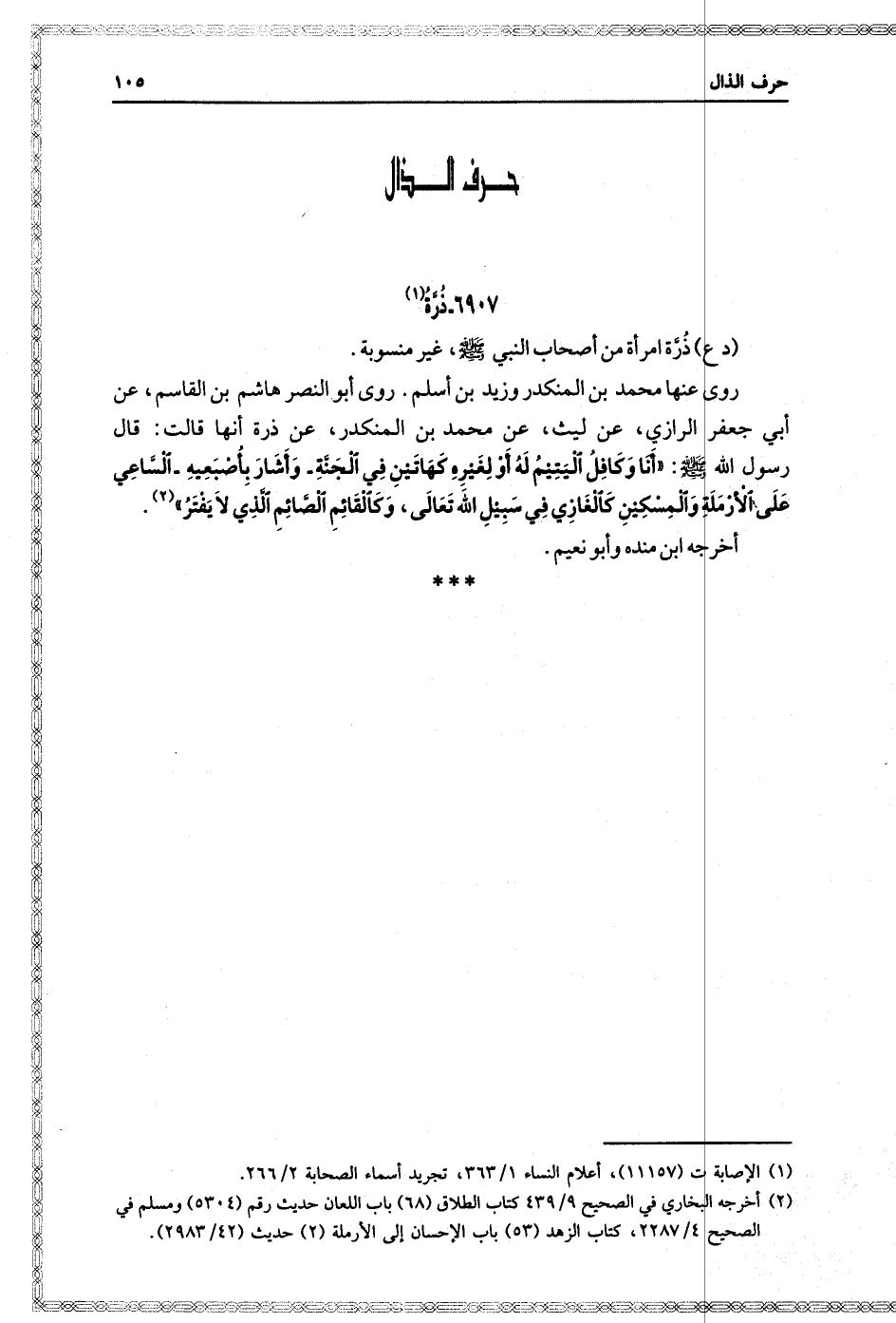 ٣٥٥٤ روى أبو النصر هاشم بن القاسم، عن أبي جعفر الرازي، عن ليث، عن محمد بن المنكدر، عن ذرة، أنها قالت: قال رسول الله صَلَّى اللَّهُ عَلَيْهِ وَسَلَّمَ: " أنا وكافل اليتيم له أو لغيره كهاتين في الجنة، وأشار بإصبعيه، الساعي على الأرملة والمسكين كالغازي في سبيل الله تعالى، وكالقائم الصائم الذي لا يفتر ".