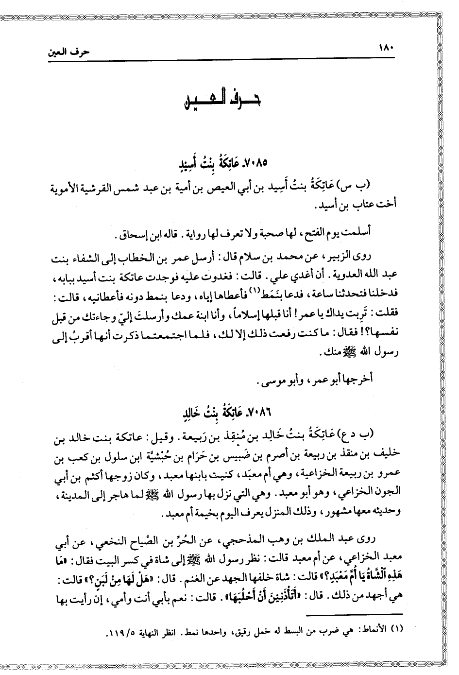 ب د ع: عاتكة بنت خالد بن منقذ بن ربيعة وقيل عاتكة بنت خالد بن خليف بن منقذ بن ربيعة بن أصرم بن ضبيس بن حرام بن حبشية بن سلول بن كعب بن عمرو بن ربيعة الخزاعية وهي أم معبد كنيت بابنها معبد.