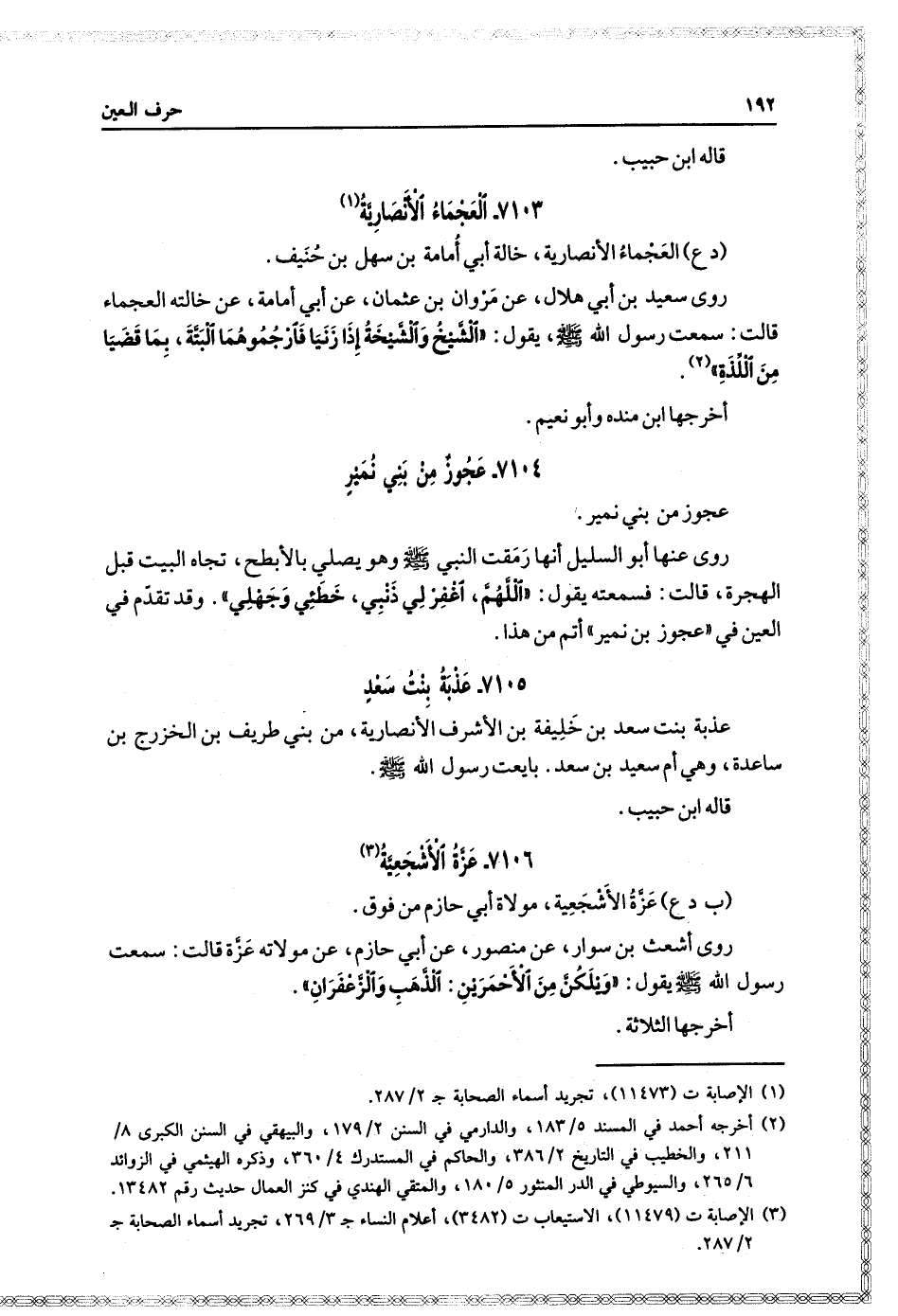 د ع: العجماء الأنصارية خالة أبي أمامة بن سهل بن حنيف ٣٦٥٧ روى سعيد بن أبي هلال، عن مروان بن عثمان، عن أبي أمامة، عن خالته العجماء، قالت سمعت رسول الله صَلَّى اللَّهُ عَلَيْهِ وَسَلَّمَ يقول: " الشيخ والشيخة إذا زنيا فارجموهما ألبتة، بما قضيا من اللذة ".