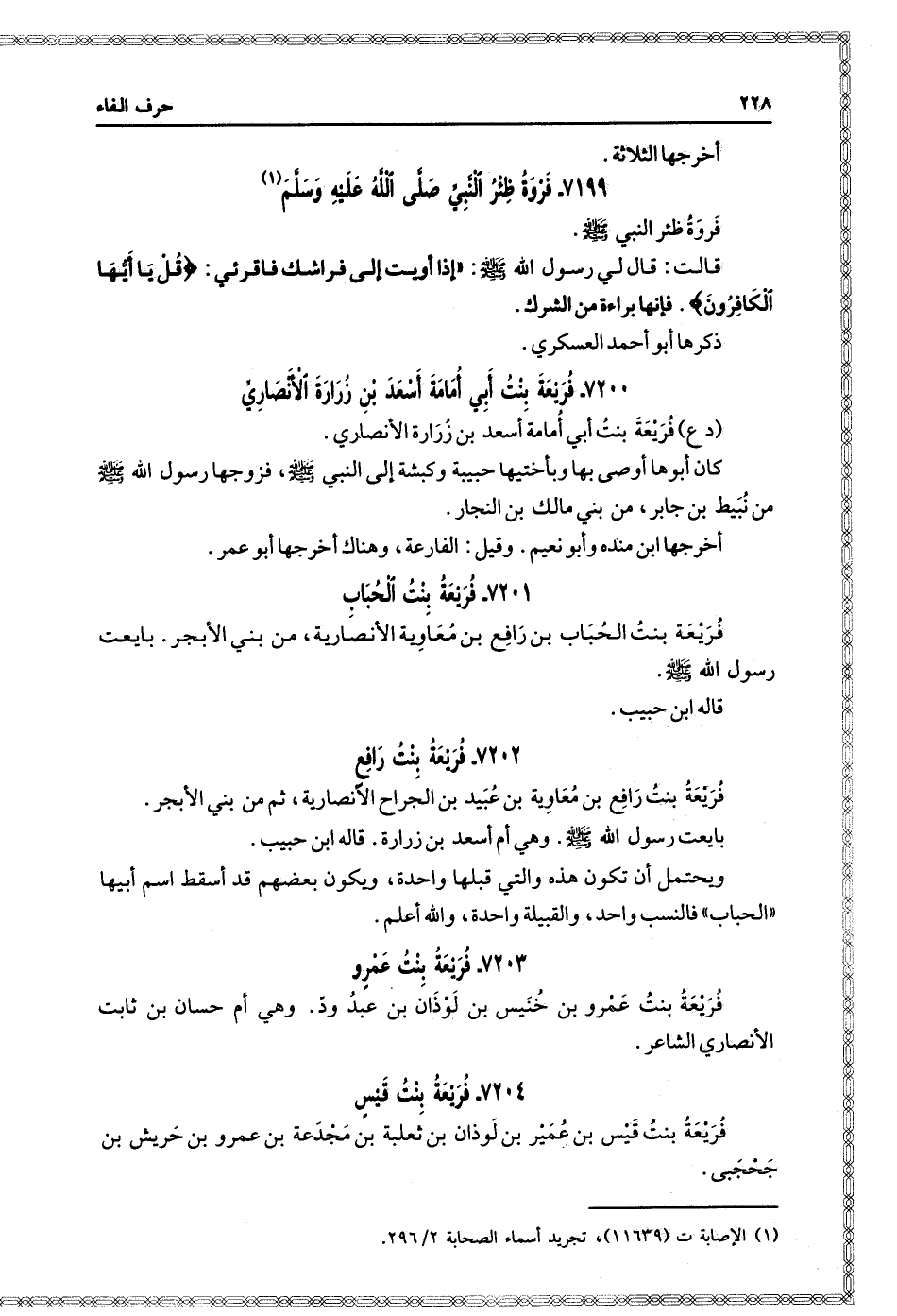٧٢٠٠- فريعة بنت أبي أمامة أسعد بن زرارة الأنصاري