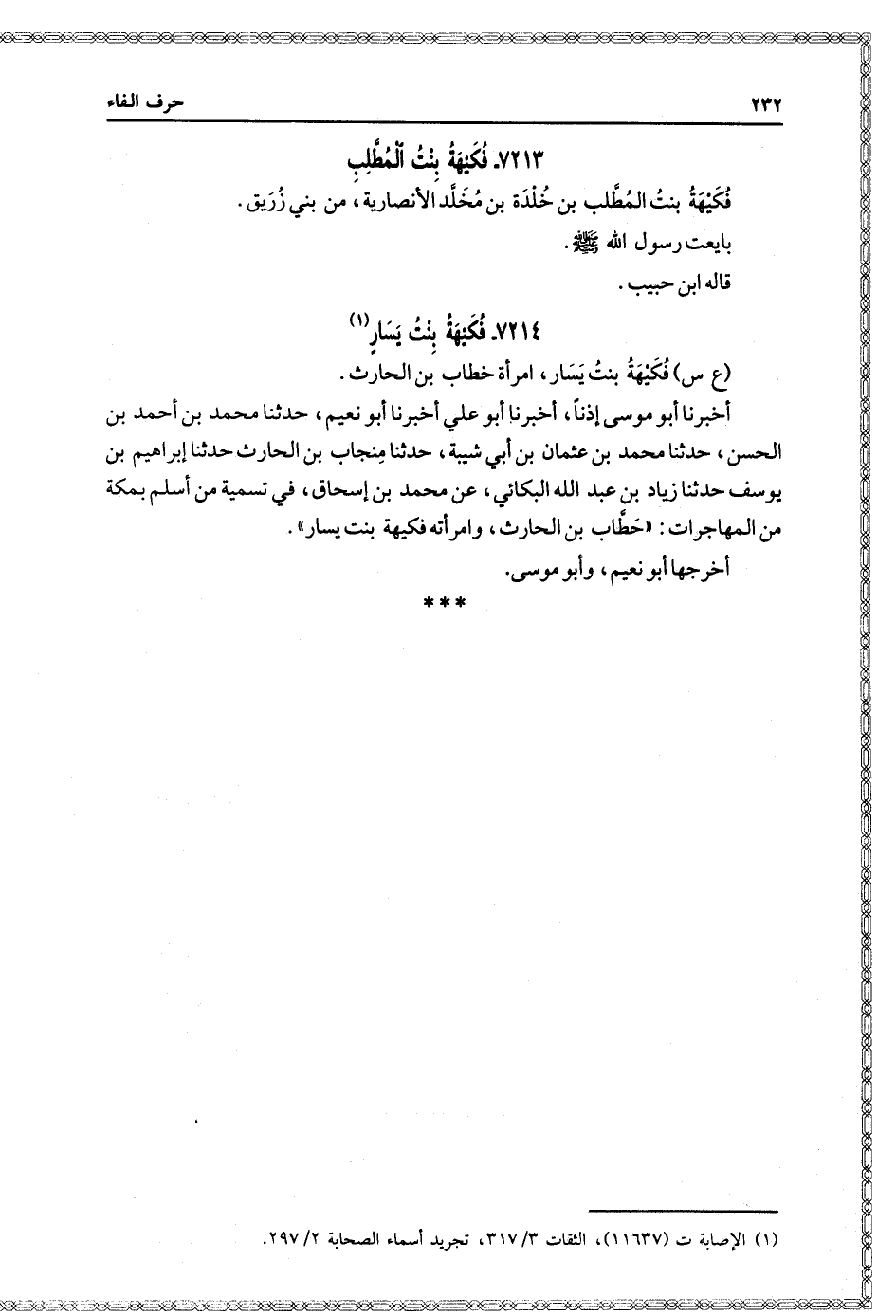 (٢٣٦٨) أخبرنا أبو موسى، إذنا، أخبرنا أبو علي، أخبرنا أبو نعيم، حدثنا محمد بن أحمد بن الحسن، حدثنا محمد بن عثمان بن أبي شيبة، حدثنا منجاب بن الحارث، حدثنا إبراهيم بن يوسف، حدثنا زياد بن عبد الله البكائي، عن محمد بن إسحاق، في تسمية من أسلم بمكة من المهاجرات: حطاب بن الحارث، وامرأته فكيهة بنت يسار.