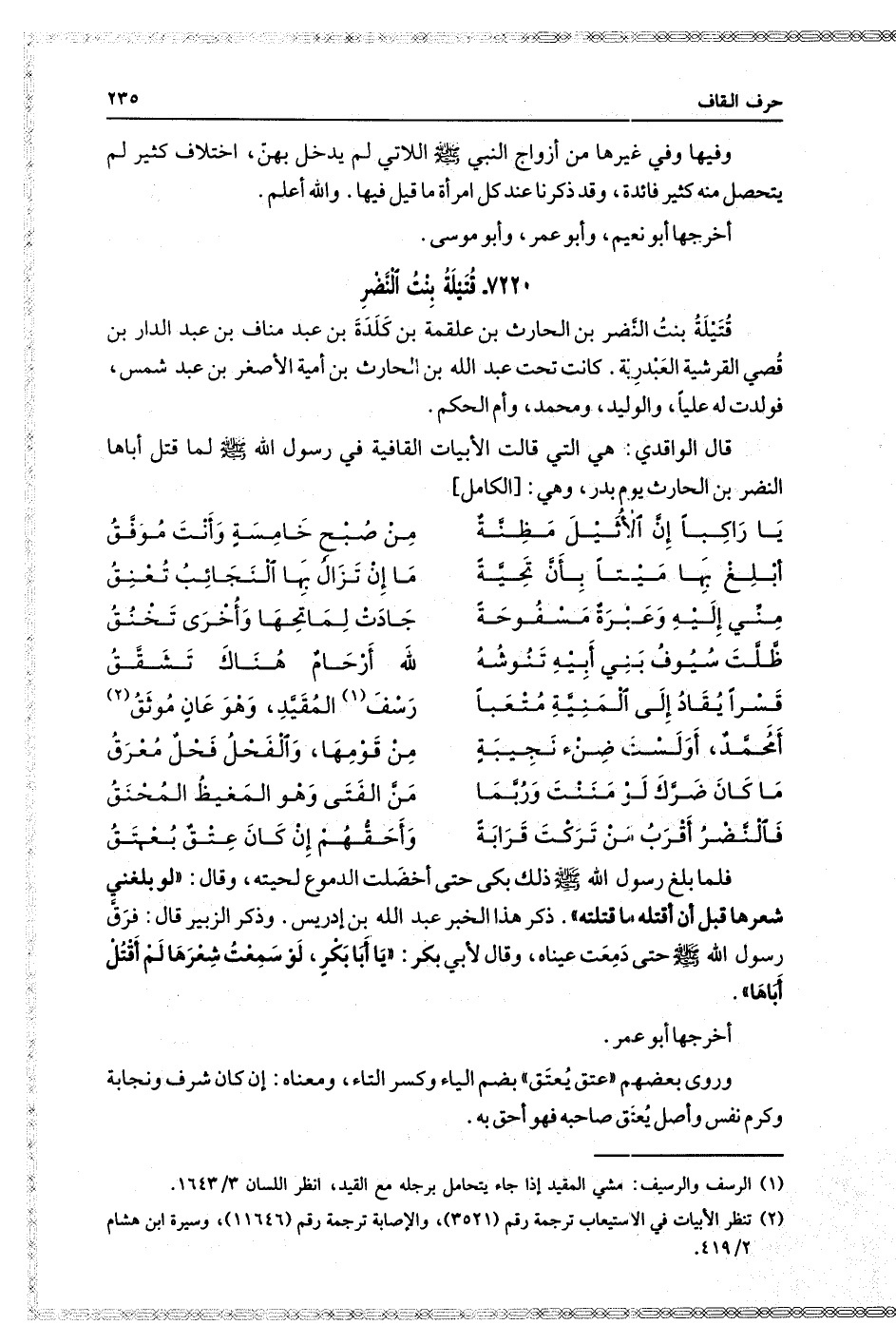 قال الواقدي: هي التي قالت الأبيات القافية في رسول الله صَلَّى اللَّهُ عَلَيْهِ وَسَلَّمَ لما قتل أباها النضر بن الحارث يوم بدر، وهي: