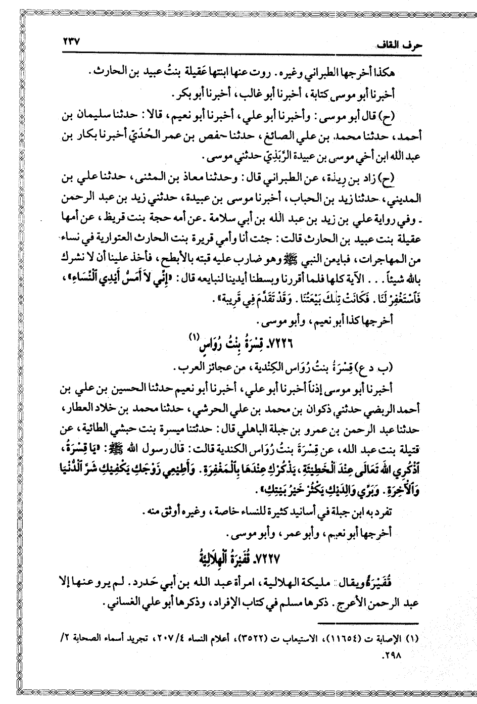 (٢٣٧١) أخبرنا أبو موسى، إذنا، أخبرنا أبو علي، أخبرنا أبو نعيم، حدثنا الحسين بن علي بن أحمد الربضي، حدثني ذكوان بن محمد بن علي الحرشي، حدثنا محمد بن خلاد العطار، حدثنا عبد الرحمن بن عمرو بن جبلة الباهلي، قال: حدثنا ميسرة بنت حبشي الطائية، عن قتيلة بنت عبد الله، عن قسرة بنت رواس الكندية، قالت: قال رسول الله صَلَّى اللَّهُ عَلَيْهِ وَسَلَّمَ: " يا قسرة، أذكري الله تعالى عند الخطيئة، يذكرك عندها بالمغفرة.