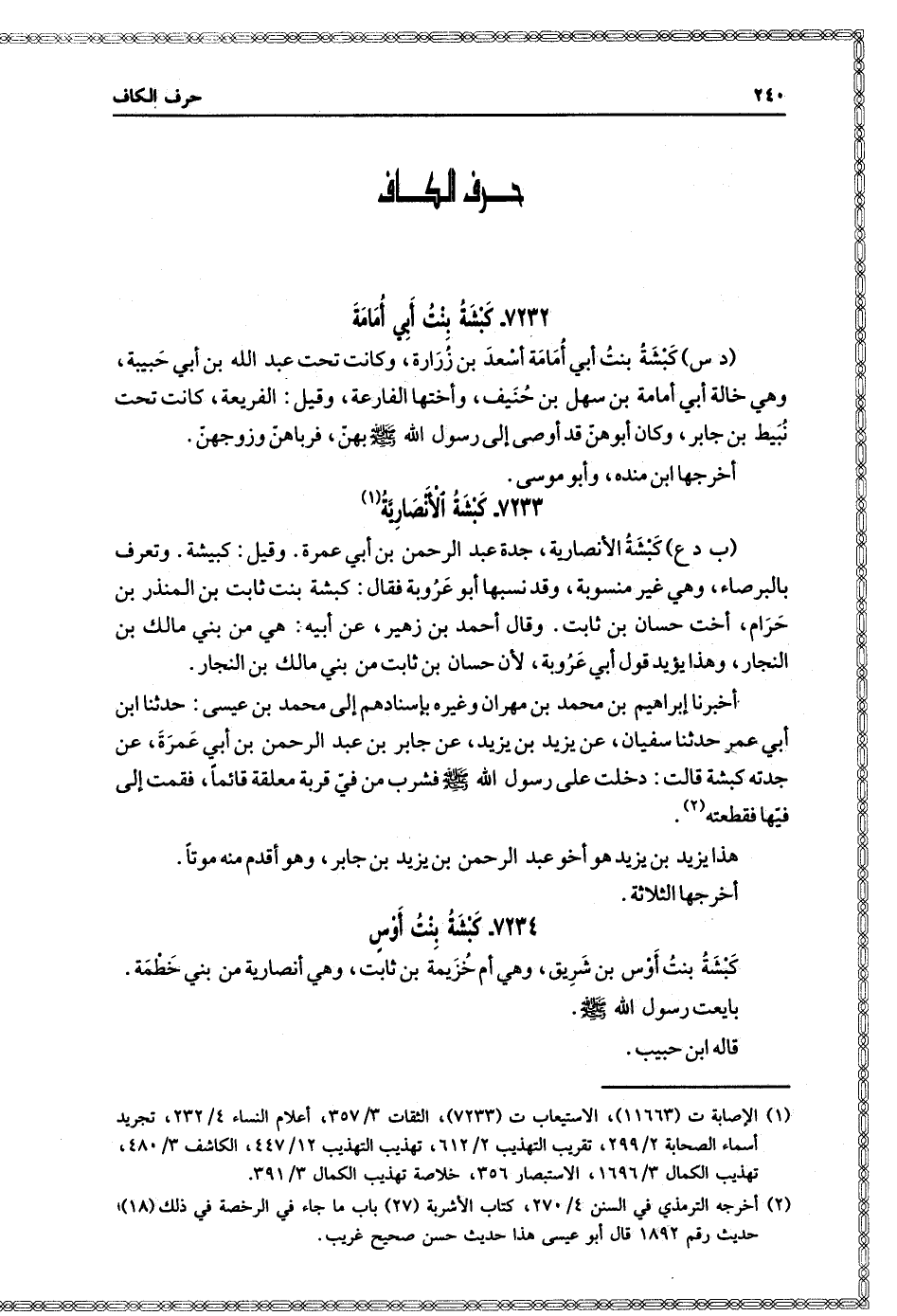 وتعرف بالبرصاء، وهي غير منسوبة، وقد نسبها أبو عروبة فقال: كبشة بنت ثابت بن المنذر بن حرام، أخت حسان بن ثابت.