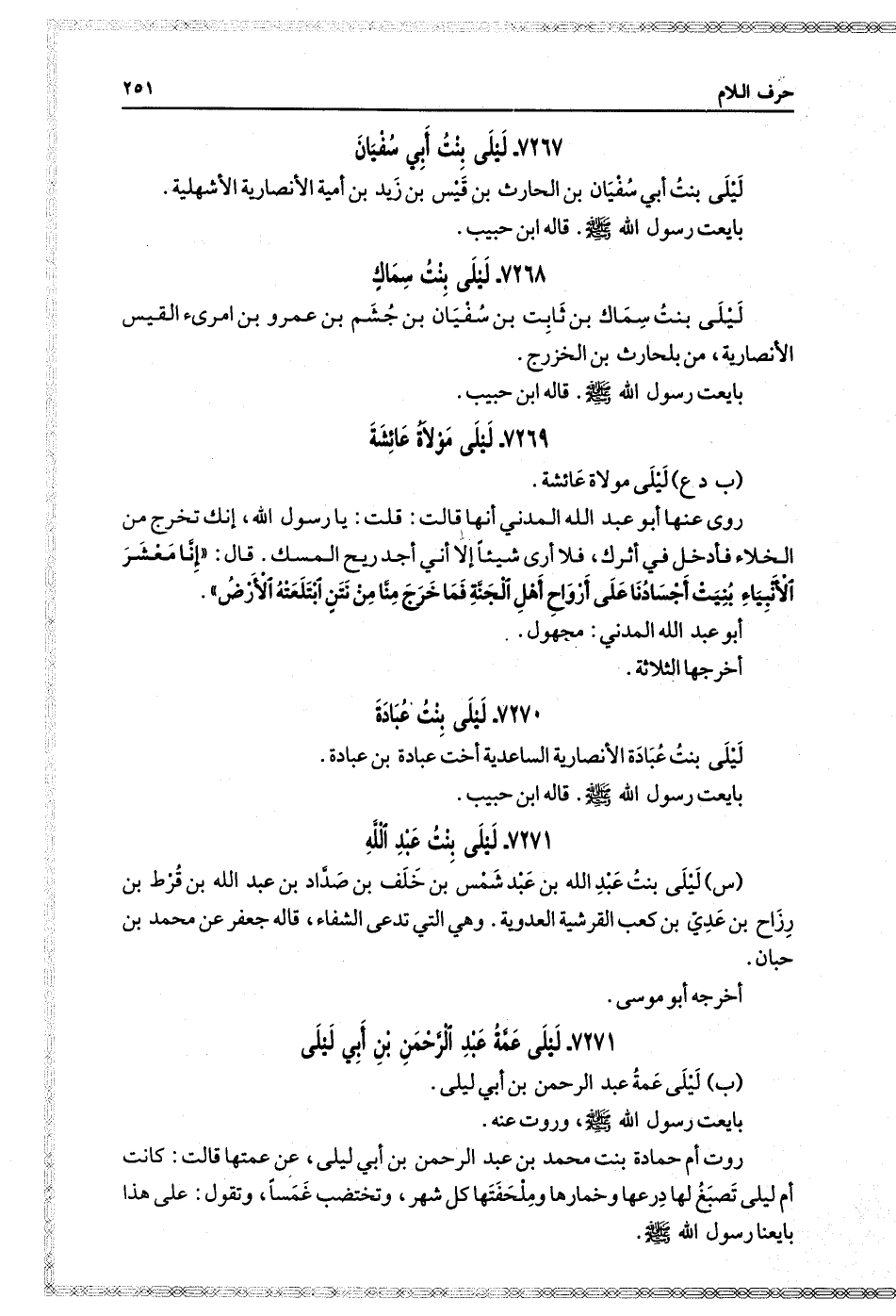 ب: ليلى عمة عبد الرحمن بن أبي ليلى بايعت رسول الله صَلَّى اللَّهُ عَلَيْهِ وَسَلَّمَ وروت عنه.