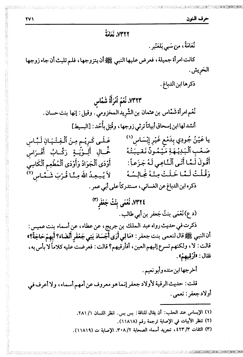 نعم امرأة شماس بن عثمان بن الشريد المخزومي وقيل إنها بنت حسان أنشد لها ابن إسحاق أبياتا ترثي زوجها، وقتل بأحد: يا عين جودي بدمع غير إبساس على كريم من الفتيان لباس صعب البديهة ميمون نقيبته حمال ألوية ركاب أفراس اقول لما أتى الناعي له جزعا أودى الجواد وأودى المطعم الكاسي وقلت لما خلت منه مجالسه لا يبعد الله منا قرب شماس ذكره ابن الدباغ عن الغساني، مستدركا على أبي عمر.