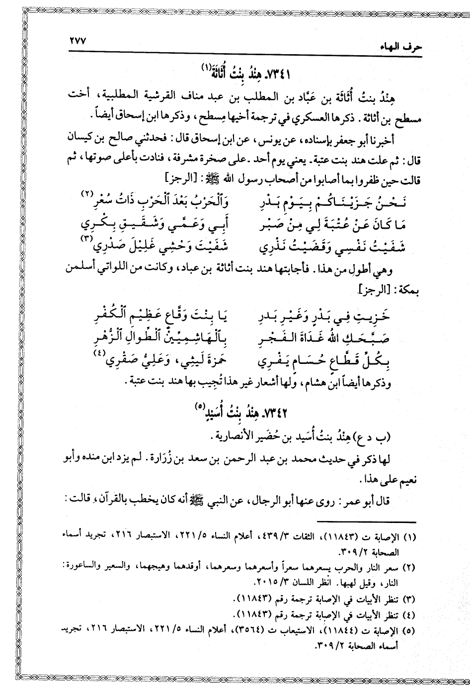 (٢٤٠٠) أخبرنا أبو جعفر، بإسناده، عن يونس، عن ابن إسحاق، قال: فحدثني صالح بن كيسان، قال: ثم علت هند بنت عتبة، يعني يوم أحد على صخرة مشرفة، فنادت بأعلى صوتها، ثم قالت حين ظفروا بما أصابوا من أصحاب رسول الله صَلَّى اللَّهُ عَلَيْهِ وَسَلَّمَ: هند بنت أثاثة بن عباد، وكانت من اللواتي أسلمن بمكة: