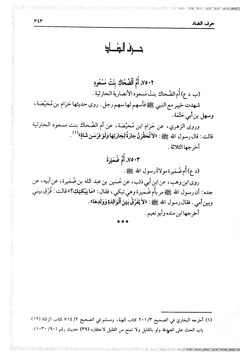 ب د ع: أم الضحاك بنت مسعود الأنصارية الحارثية شهدت خيبر مع النبي صَلَّى اللَّهُ عَلَيْهِ وَسَلَّمَ فأسهم لها سهم رجل.