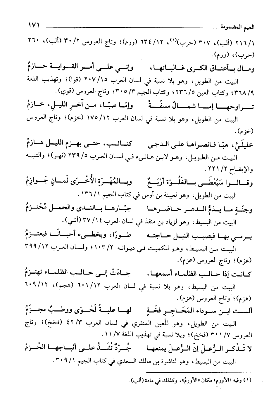 1/ 216 (ألب)، 307 (حرب) (¬1)، 12/ 634 (ورم)؛ وتاج العروس 2/ 30 (ألب)، 260 (حرب)، (ورم).