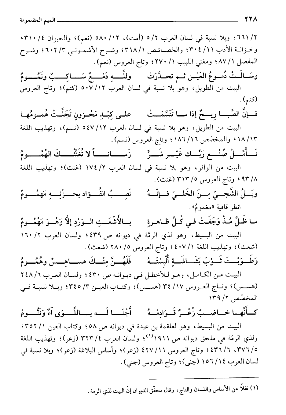 2/ 661؛ وبلا نسبة في لسان العرب 2/ 5 (أمت)، 12/ 580 (نعم)؛ والحيوان 4/ 310 وخزانة الأدب 11/ 304؛ والخصائص 1/ 318؛ وشرح الأشموني 3/ 602؛ وشرح المفصل 1/ 87؛ ومعنى اللبيب 1/ 270، وتاج العروس (نعم).