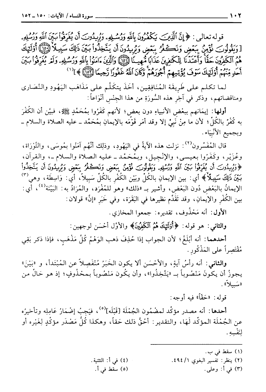قال المُفَسِّرون: نزلت هذه الآيةٌ في اليَهُودِ، وذلِك أنَّهُم آمَنُوا بمُوسَى، والتَّوْرَاة، وعُزَيْر، وكَفَرُوا بعيسى، والإنْجِيل، وبمُحَمَّد - عَلَيْهِ الصَّلَاة وَالسَّلَام ُ -، والقرآن، {وَيُرِيدُونَ أَن يُفَرِّقُواْ بَيْنَ الله وَرُسُلِهِ وَيقُولُونَ نُؤْمِنُ بِبَعْضٍ وَنَكْفُرُ بِبَعْضٍ وَيُرِيدُونَ أَن يَتَّخِذُواْ بَيْنَ ذلك سَبِيلاً} أي: بين الإيمانِ بالكُلِّ وبَيْن الكُفْرِ بالكُلِّ سَبِيلاً، أي: وَاسِطَة، وهي الإيمانُ بالبَعْضِ دُون البَعْضِ، وأشير ب «ذلك» وهو للمُفْرَد، والمُرَادُ به: البَيِّنَة، أي: بين الكُفْرِ والإيمانِ، وقد تَقَدَّم نظيرها في البَقَرَة، وفي خَبَرِ «إنَّ» قولان: