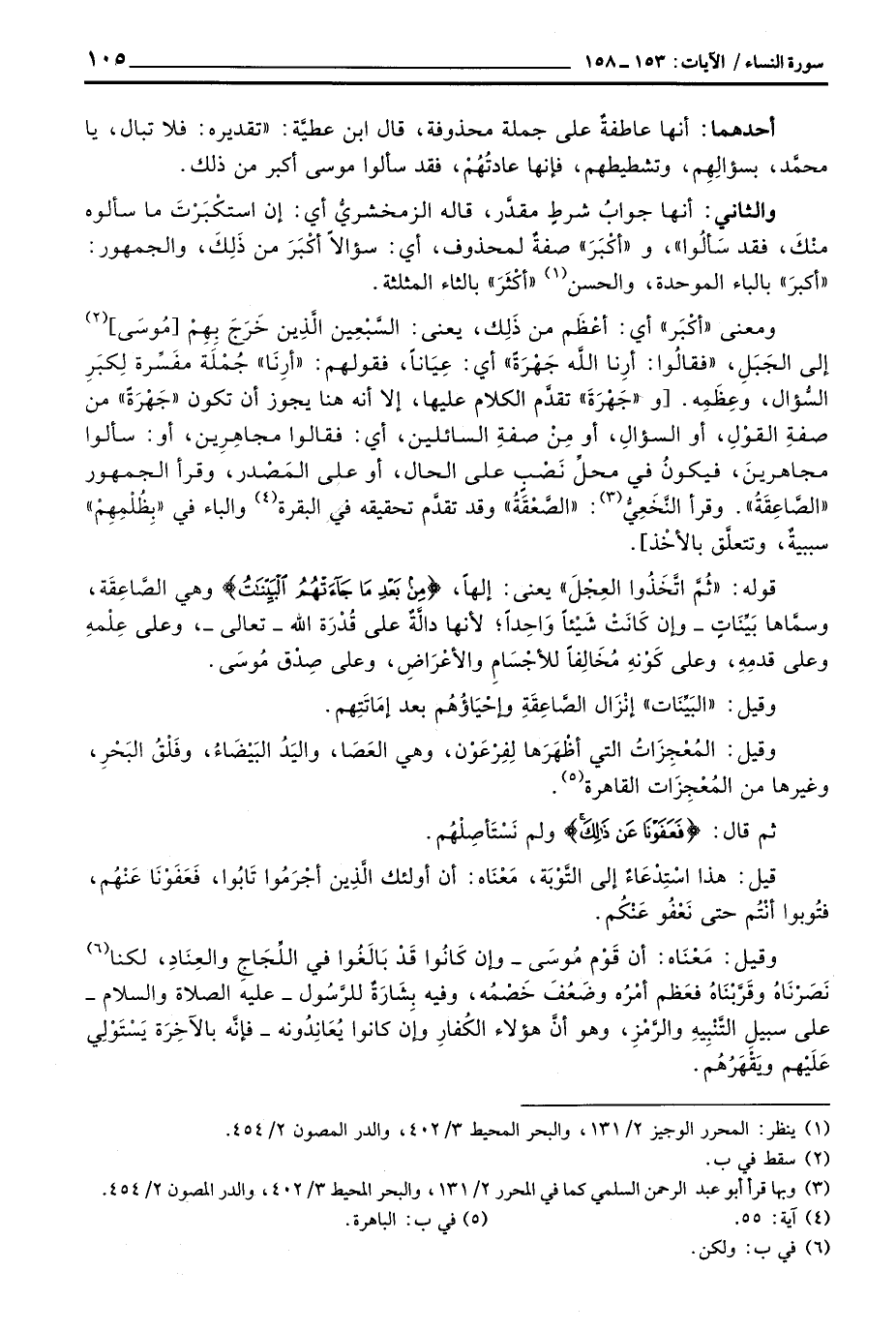 ومعنى «أكْبَر» أي: أعْظَم من ذَلِك، يعني: السَّبْعِين الَّذِين خَرَجَ بِهِمْ [مُوسَى] إلى الجَبَلِ، {فقالوا: أَرِنَا الله جَهْرَةً} أي: عِياناً، فقولهم: «أرِنَا» جُمْلَة مفَسِّرة لِكبَرِ السُّؤال، وعِظَمِه. [و «جَهْرَةَ» تقدَّم الكلام عليها، إلا أنه هنا يجوز أن تكون «جَهْرَةً» من صفةِ القوْلِ، أو السؤالِ، أو مِنْ صفةِ السائلين، أي: فقالوا مجاهِرِين، أو: سألوا مجاهرينَ، فيكونُ في محلِّ نَصْبٍ على الحال، أو على المَصْدر، وقرأ الجمهور «الصَّاعِقَةُ» . وقرأ النَّخَعِيُّ: «الصَّعْقَةُ» وقد تقدَّم تحقيقه في البقرة والباء في «بِظُلْمِهِمْ» سببيةٌ، وتتعلَّق بالأخْذ] .