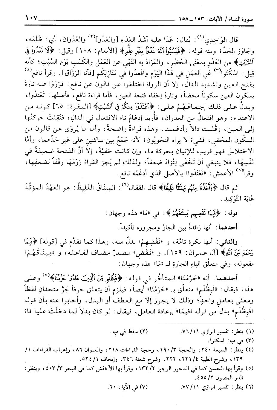 والثاني: أنها نكرة تامَّة، و «نَقْضِهِمْ» بدلٌ منه، وهذا كما تقدَّم في [قوله] {فَبِمَا رَحْمَةٍ مِّنَ الله} [آل عمران: 159] . و «نَقْضِ» مصدرٌ مضاف لفاعله، و «مِيثَاقَهُمْ» مفعوله، وفي متعلَّق الباءِ الجارةِ ل «مَا» هذه وجهان: