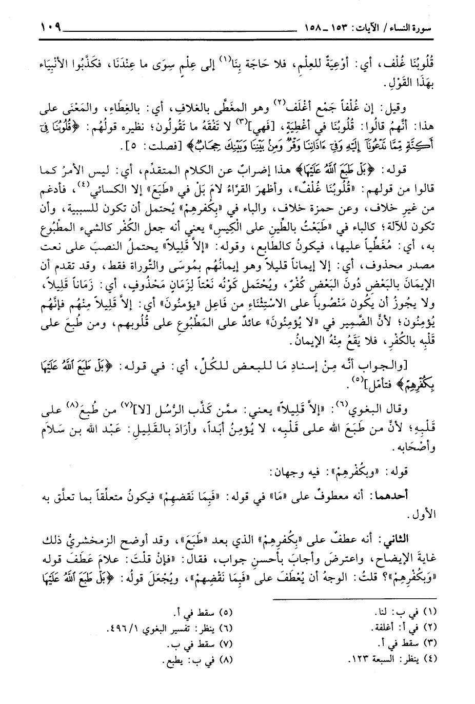 الثاني: أنه عطفٌ على «بِكُفرِهِمْ» الذي بعد «طَبَعَ» ، وقد أوضح الزمخشريُّ ذلك غايةَ الإيضاح، واعترضَ وأجابَ بأحسنِ جواب، فقال: «فإنْ قلْتَ: علامَ عَطَفَ قوله» وَبكُفْرِهِمْ «؟ قلتُ: الوجهُ أن يُعْطَفَ على» فَبِمَا نَقْضِهمْ «، ويُجْعَلَ قولُه: {بَلْ طَبَعَ الله عَلَيْهَا