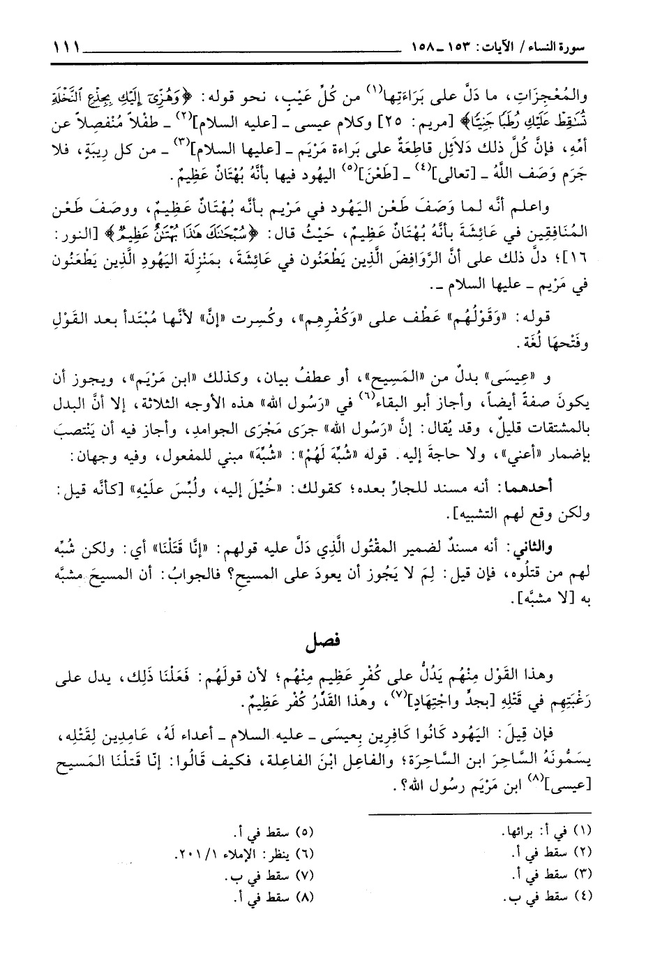 و «عِيسَى» بدلٌ من «المَسِيح» ، أو عطفُ بيان، وكذلك «ابن مَرْيَم» ، ويجوز أن يكونَ صفةً أيضاً، وأجاز أبو البقاء في «رَسُول الله» هذه الأوجه الثلاثة، إلا أنَّ البدل بالمشتقات قليلٌ، وقد يُقال: إنَّ «رَسُول الله» جرَى مَجْرَى الجوامدِ، وأجاز فيه أن يَنْتصبَ بإضمار «أعني» ، ولا حاجةَ إليه. قوله «شُبِّهَ لَهُمْ» : «شُبِّهَ» مبني للمفعول، وفيه وجهان: