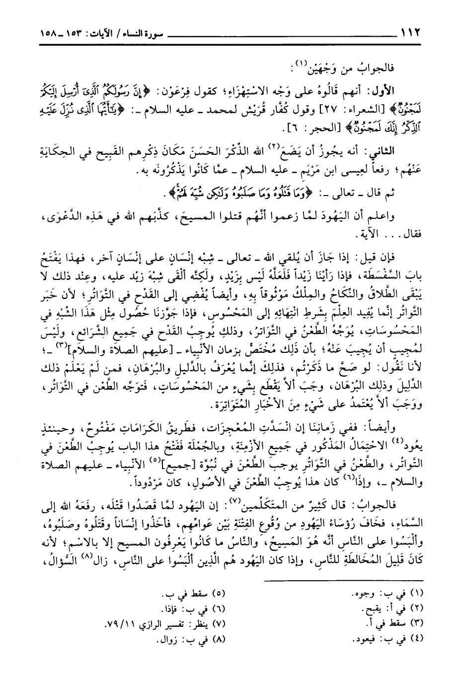 فالجوابُ: قال كَثِيرٌ من المتَكَلِّمين: إن اليَهُود لمَّا قَصَدُوا قَتْلَه، رفَعَهُ الله على السَّمَاءِ، فخَافَ رُؤسَاءُ اليَهُودِ من وُقُوعِ الفِتْنَةِ بَيْن عَوامِّهِم، فأخَذُوا إنْسَاناً وقَتَلُوه وصَلَبُوهُ، وألْبَسُوا على النَّاسِ أنَّه هُوَ المَسِيحُ، والنَّاسُ ما كَانُوا يَعْرِفُون المسيح إلا بالاسْمِ؛ لأنه كَانَ قَلِيلَ المُخَالطَةِ للنَّاسِ، وإذا كان اليَهُود هُم الَّذِين ألْبَسُوا على النَّاسِ، زال السُّؤالُ،