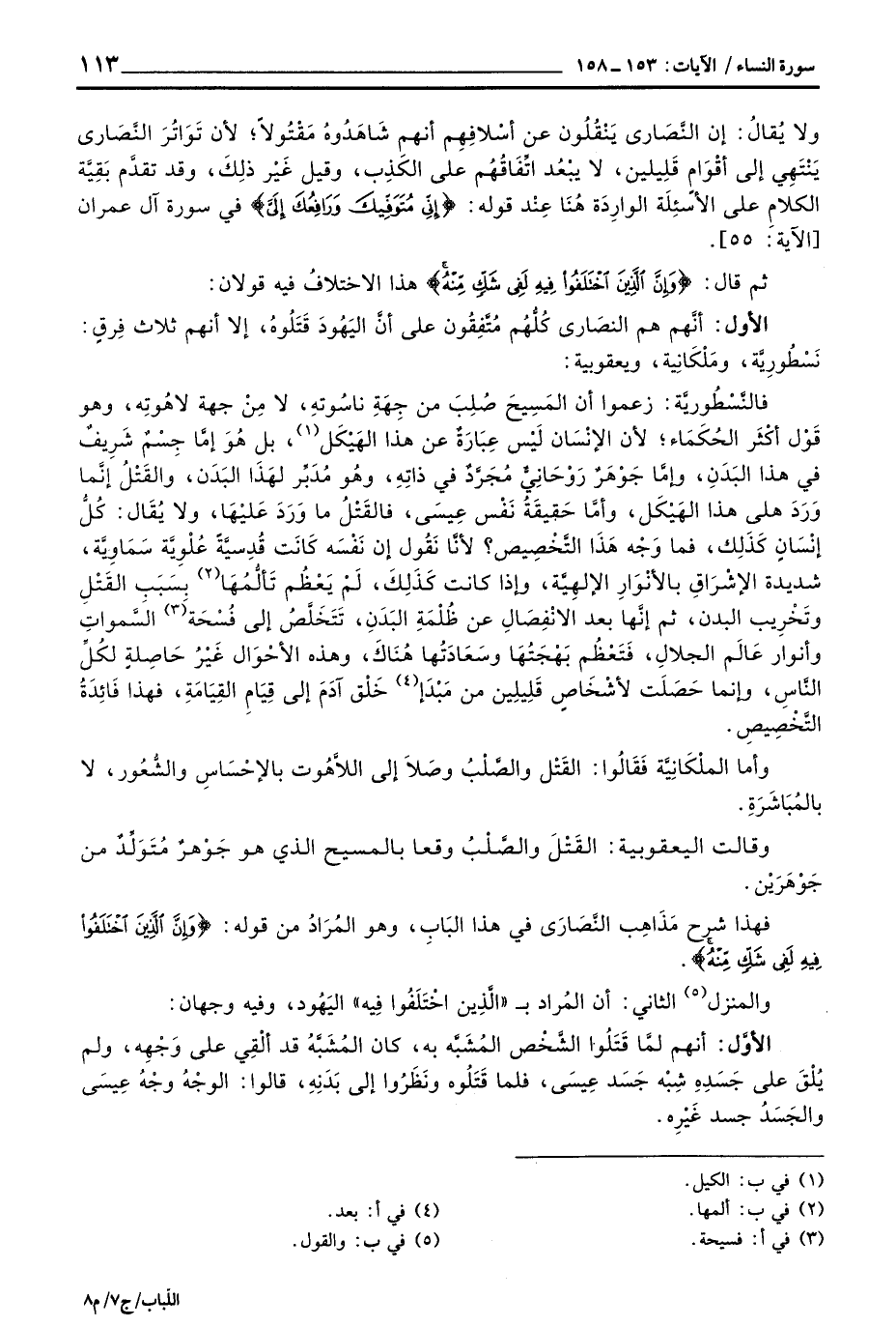 فالنَّسْطُوريَّة: زعموا أن المَسِيحَ صُلِبَ من جِهَةِ ناسُوتهِ، لا مِنْ جهة لاهُوتِه، وهو قَوْل أكْثَر الحُكَمَاء؛ لأن الإنْسَان لَيْس عِبَارَةٌ عن هذا الهَيْكَل، بل هُوَ إمَّا جِسْمٌ شَرِيفٌ في هذا البَدَنِ، وإمَّا جَوْهَرٌ رَوْحَانِيٌّ مُجَرَّدٌ في ذاتِهِ، وهُو مُدَبِّر لهَذَا البَدَن، والقَتْلُ إنَّما وَرَدَ هلى هذا الهَيْكَل، وأمَّا حَقيقَةُ نَفْس عِيسَى، فالقَتْلُ ما وَرَدَ عَليْهَا، ولا يُقَال: كُلُّ إنْسَانٍ كَذَلِك، فما وَجْه هَذَا التَّخْصِيص؟ لأنَّا نَقُول إن نَفْسَه كَانَت قُدِسيَّةً عُلْوِيَّة سَمَاوِيَّة، شديدة الإشْرَاقِ بالأنْوَارِ الإلهِيَّة، وإذا كانت كَذَلِكَ، لَمْ يَعْظُم تَألُّمُهَا بِسَبَبِ القَتْلِ وتَخْرِيب البدن، ثم إنَّها بعد الانْفِصَالِ عن ظُلْمَةِ البَدَنِ، تَتَخَلَّصُ إلى فُسْحَة السَّمواتِ وأنوار عَالَم الجلالِ، فَتَعْظُم بَهْجَتُهَا وسَعَادَتُها هُنَاكَ، وهذه الأحْوَال غَيْرُ حَاصِلةٍ لكُلِّ النَّاسِ، وإنما حَصَلَت لأشْخَاصٍ قَلِيلِين من مَبْدَإ خَلْق آدَمَ إلى قِيَامِ القِيَامَةِ، فهذا فَائِدَةُ التَّخْصِيصِ.