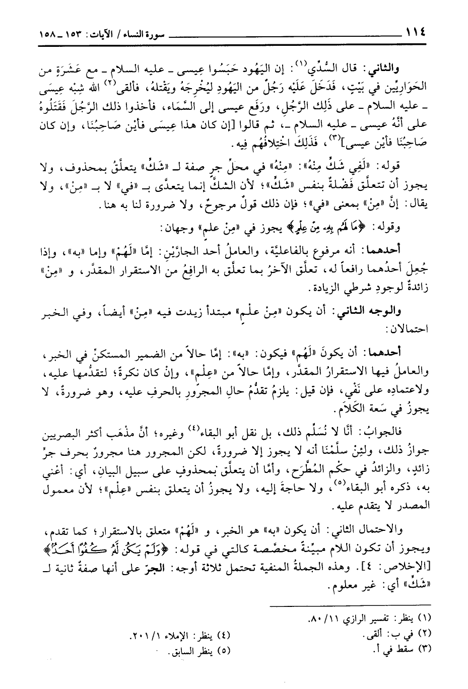 والثاني: قال السُّدِّي: إن اليَهُود حَبَسُوا عِيسى - عليه السلام - مع عَشَرَةٍ من الحَوَارِييّن في بَيْتٍ، فَدَخَلَ عَلَيْه رَجُلٌ من اليَهُودِ ليُخْرِجَهُ ويَقْتلهُ، فألقى الله شِبْه عِيسَى - عليه السلام - على ذَلِك الرَّجُلِ، ورَفَع عيسى إلى السَّماء، فأخذوا ذلك الرَّجُل فَقَتَلُوهُ على أنَّه عيسى - عليه السلام -، ثم قالوا [إن كان هذا عِيسَى فأيْن صَاحِبُنَا، وإن كان صَاحِبُنَا فأيْن عيسى] ، فَذَلِكَ اخْتِلافُهُم فِيه.