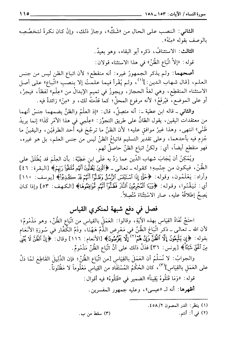 ويُمْكِنُ أن يُجَابَ شهاب الدِّين عما رَدَّ به عَلَى ابن عَطِيَّة: بأن العِلْمَ قد يُطْلَقُ على الظَّنِّ، فيكون من جِنْسِهِ؛ كقوله - تعالى - {الذين يَظُنُّونَ أَنَّهُم مُّلاَقُو رَبِّهِمْ} [البقرة: 46] وأراد: يَعْلَمُون، وقوله: {حتى إِذَا استيأس الرسل وظنوا أَنَّهُمْ قَدْ كُذِبُواْ} [يوسف: 110] أي: تَيَقَّنُوا، وقوله: {وَرَأَى المجرمون النار فظنوا أَنَّهُمْ مُّوَاقِعُوهَا} [الكهف: 53] وإذا كان يَصِحُّ إطلاقُهُ عليه، صار الاسْتِثْنَاءُ مُتَّصِلاً.