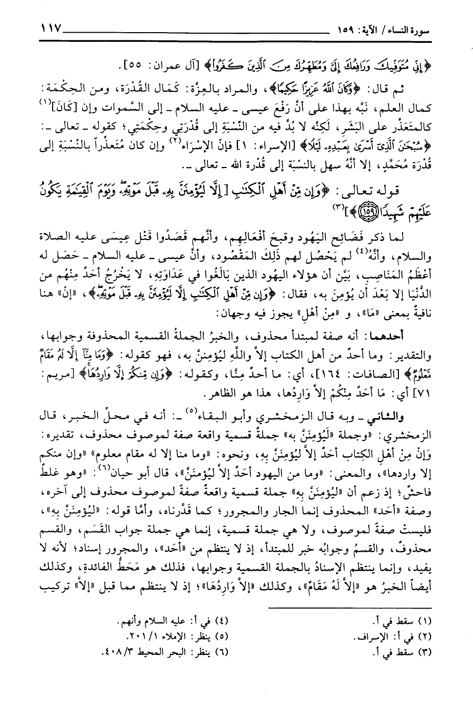 لما ذكر فَضَائِح اليَهُود وقبحَ أفْعَالِهِم، وأنَّهم قَصَدُوا قَتْل عِيسَى عَلَيْهِ الصَّلَاة وَالسَّلَام ُ، وأنَّه لم يَحْصُل لهم ذَلِكَ المَقْصُود، وأنَّ عيسى - عليه السلام - حَصَل له أعْظَمُ المَنَاصِبِ، بَيَّن أن هؤلاء اليهُود الذين بَالَغُوا في عَدَاوَتِهِ، لا يَخْرُجُ أحَدٌ مِنْهُم من الدُّنْيَا إلا بَعْدَ أن يُؤمِنَ به، فقال: {وَإِن مِّنْ أَهْلِ الكتاب إِلاَّ لَيُؤْمِنَنَّ بِهِ قَبْلَ مَوْتِهِ} ، «إنْ» هنا نافيةٌ بمعنى «مَا» ، و «مِنْ أهْلِ» يجوز فيه وجهان:
