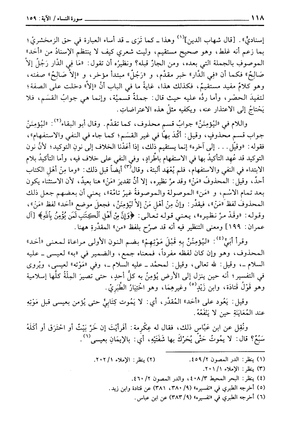 وقيل: يَعُود على» أحَد «المُقدَّر، أي: لا يَمُوت كِتَابِيٌّ حتى يُؤمن بعيسى قبل مَوْتِهِ عند المُعَايَنَةِ حين لا يَنْفَعُهُ.