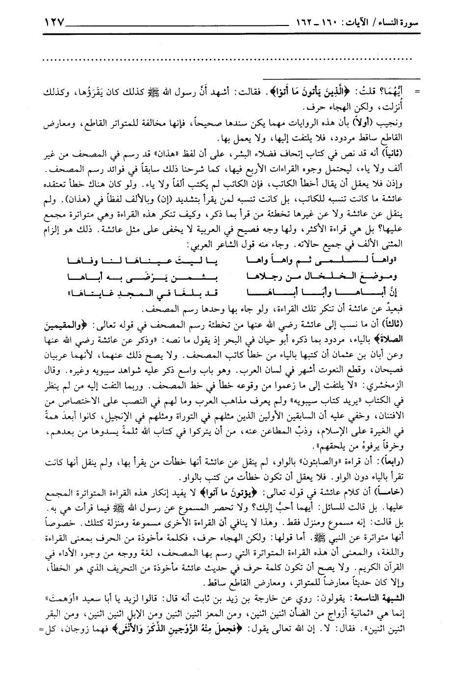 مذاهبَ العَرَبِ وما لهم في النصْبِ على الاختصاص من الافتنانِ، وغَبِيَ عليه أنَّ السابقين الأولين الذين مَثَلهُم في التوراة ومثلُهم في الإنجيل، كانوا أبعدَ همةً في الغَيْرَةِ عن الإسلام وذَبِّ المَطَاعِن عنه من أن يقولوا ثُلْمَةً في كتاب الله؛ ليسُدَّها من بَعْدَهم، وخَرْقاً يَرْفُوهُ مَنْ يلحَقُ بهم» . وأمَّا قراءةُ الرفْعِ، فواضحةٌ.