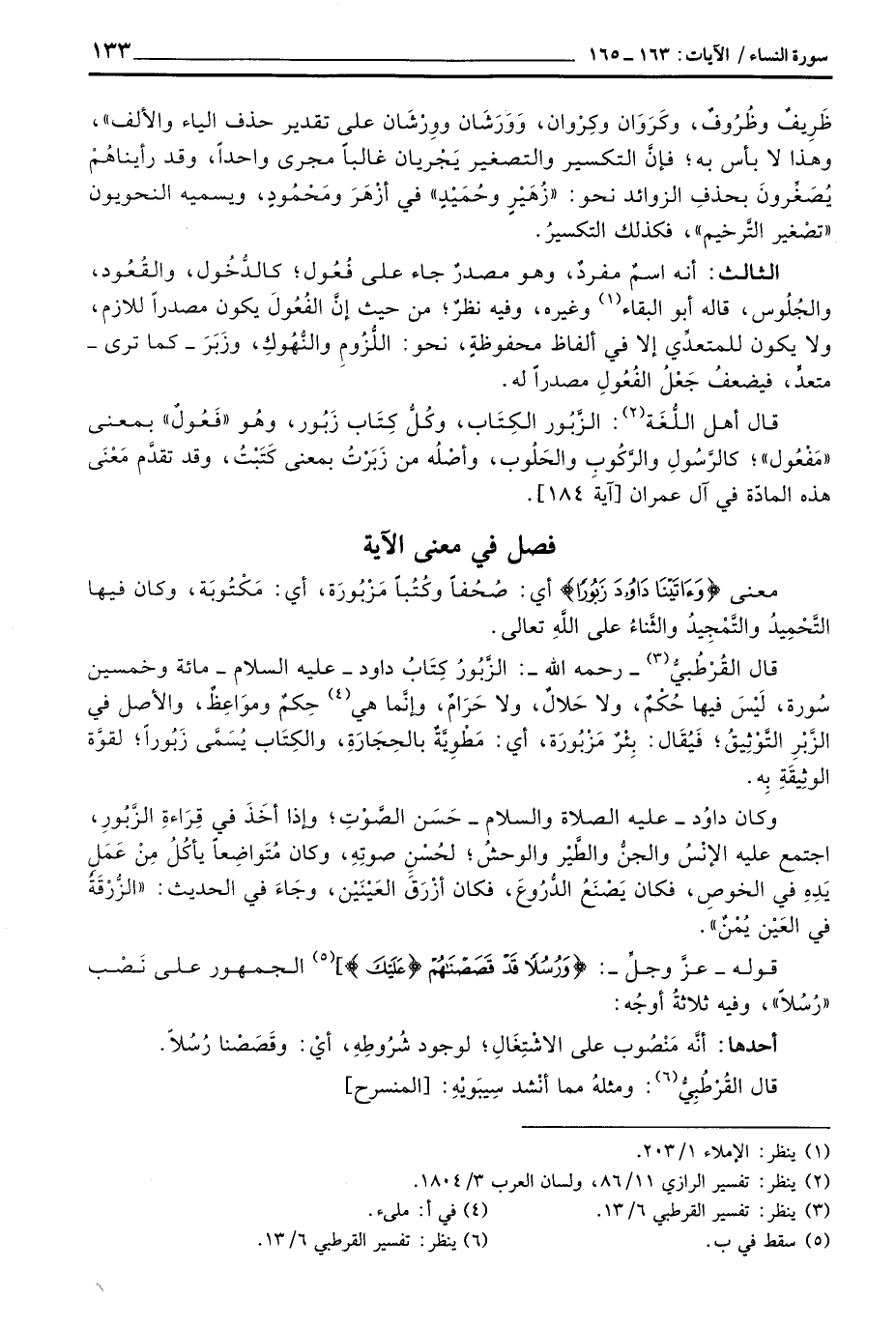 قال القُرْطُبيُّ - رَحِمَهُ اللَّهُ -: الزَّبُورُ كِتَابُ داود - عليه السلام - مائة وخمسين سُورة، لَيْسَ فيها حُكْمٌ، ولا حَلالٌ، ولا حَرَامٌ، وإنَّما هي حِكمٌ وموَاعِظٌ، والأصل في الزَّبْرِ التَّوْثِيقُ؛ فَيُقَال: بِئْرٌ مَزْبُورَة، أي: مَطْوِيَّةٌ بالحِجَارَةِ، والكِتَاب يُسَمَّى زَبُوراً؛ لقوَّة الوثِيقَةِ بِه.
