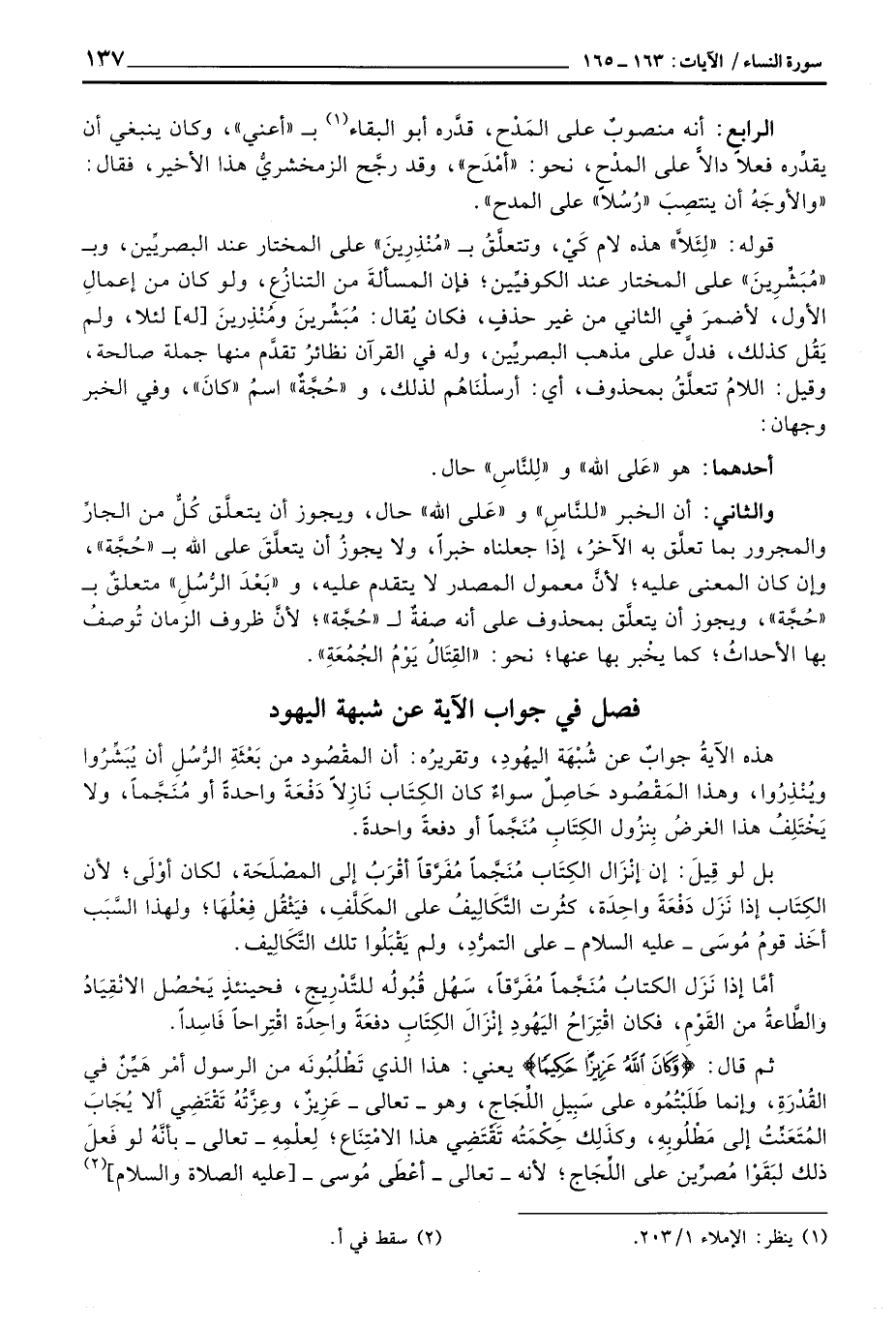 هذه الآيةُ جوابٌ عن شُبْهَة اليهُودِ، وتقريرُه: أن المقْصُود من بَعْثَةِ الرُّسُلِ أن يُبَشِّرُوا ويُنْذِرُوا، وهذا المَقْصُود حَاصِلٌ سواءٌ كان الكِتَاب نَازِلاً دَفْعَةً واحدةً أو مُنَجَّماً، ولا يَخْتَلِفُ هذا الغرضُ بِنزُول الكِتَابِ مُنَجَّماً أو دفعةً واحدةً.