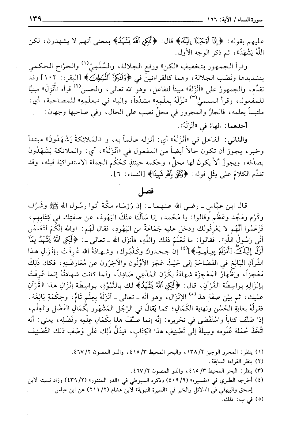 قال ابن عبَّاسٍ - رَضِيَ اللَّهُ عَنْهما -: إن رُؤسَاء مكَّةَ أتوا رسُول الله صَلَّى اللَّهُ عَلَيْهِ وَسَلَّم َ وشَرَّف وكَرَّم ومَجَّد وعَظَّم وقالوا: يا مُحمَّد، إنا سَألْنَا عنْكَ اليَهُودَ، عن صفتِك في كِتَابِهِم، فَزَعَمُوا أنَّهُم لا يَعْرِفُونَك ودخل عليه جَمَاعَةٌ من اليَهُودِ، فقال لَهُم: «والله إنَّكُمْ لتَعَلمُن أنِّي رَسُولُ اللَّهِ» فقالوا: ما نَعْلَمُ ذلك واللَّهِ، فأنزلَ الله - تعالى -: {لكن الله يَشْهَدُ بِمَآ أَنزَلَ إِلَيْكَ [أَنزَلَهُ بِعِلْمِهِ} ] إن جحدوك وكَذَّبُوك، وشهادَةُ الله عُرِفَتْ بإنْزَالِ هذا القُرآنِ البَالِغ في الفَصَاحَةِ إلى حَيْثُ عَجَز الأوَّلُون والآخِرُون عن مُعَارَضَتِهِ، فكان ذَلِكَ مُعْجِزاً، وإظْهَارُ المُعْجِزَة شهادَةٌ بكَوْن المُدَّعِي صَادِقاً، ولما كانت شهادتُهُ إنما عُرِفَتْ بإنْزَالِهِ بواسِطَة القُرْآنِ، قال: {لكن الله يَشْهَدُ} لك بالنُّبُوَّةِ، بواسِطَة إنْزَالِ هذا القُرْآنِ عليك، ثم بيَّن صفَة هذا الإنْزَال، وهو أنَّه - تعالى - أنْزَلَهُ بِعِلْمٍ تَامٍّ، وحِكْمَةٍ بَالِغَة. فقولُهُ بغايَةِ الحُسْن ونهاية الكَمَالِ؛ كما يُقالُ في الرَّجُل المَشْهُور بكَمَالِ الفَضْل والعِلْم، إذا صَنَّف كتاباً واسْتَقْصَى في تحْريره: إنَّه إنما صنَّفَ هذا بكَمَالِ عِلْمِه وفَضْلِه، يعني: أنه اتَّخَذَ جُمْلَة عُلُومه وسِيلَةً إلى تَصْنِيفِ هذا الكِتَابِ، فيدُلُّ ذَلِك عَلَى وَصْفِ ذلك التَّصْنِيف