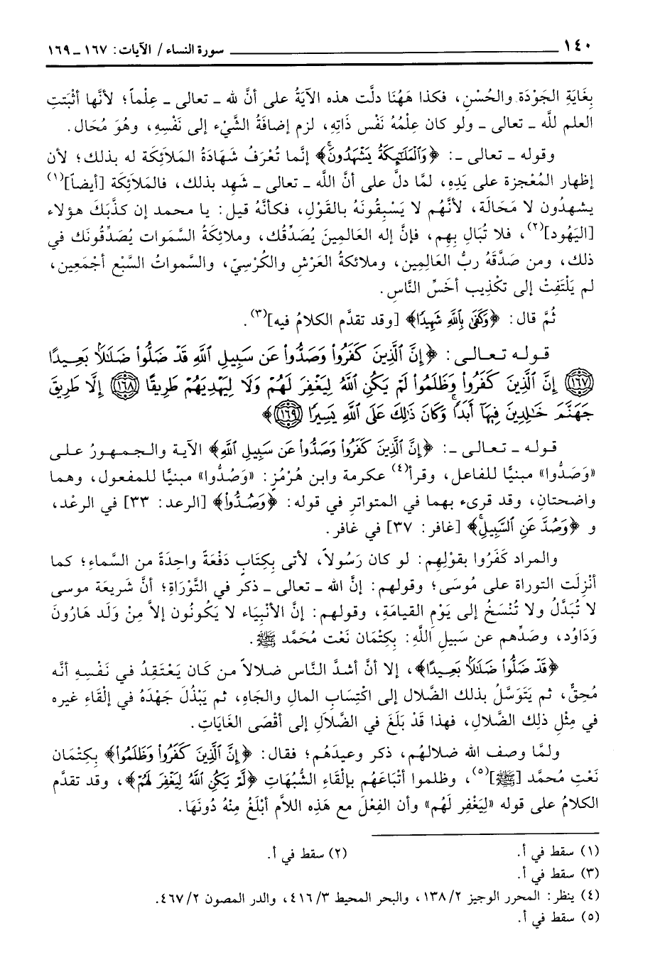 والمراد كَفَرُوا بقوْلِهِم: لو كان رَسُولاً، لأتى بِكِتَابٍ دَفْعَةً واحِدَةً من السَّماءِ؛ كما أنْزِلَت التوراة على مُوسَى؛ وقولهم: إنَّ الله - تعالى - ذكر في التَّوْرَاةِ؛ أنَّ شَريعَة موسى لا تُبَدَّلُ ولا تُنْسَخُ إلى يَوْمِ القيامَةِ، وقولهم: إنَّ الأنبْيِاءَ لا يَكُونُون إلاَّ مِنْ وَلَد هَارُونَ وَدَاوُد، وصَدِّهم عن سَبيلِ اللَّهِ: بِكِتْمَان نَعْت مُحَمَّد صَلَّى اللَّهُ عَلَيْهِ وَسَلَّم َ.