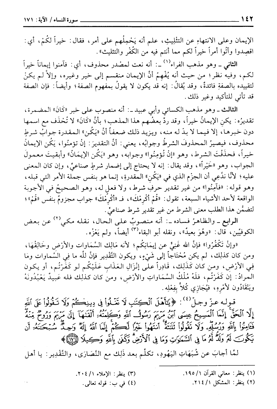 الثالث - وهو مذهب الكسائي وأبي عبيد -: أنه منصوب على خبر «كَانَ» المضمرة، تقديرُه: يكنِ الإيمانُ خيراً، وقد ردَّ بعضُهم هذا المذهب؛ بأنَّ «كَانَ» لا تُحْذَف مع اسمها دون خبرها، إلا فيما لا بدّ له منه، ويزيد ذلك ضعفاً أنَّ «يَكُن» المقدرة جوابُ شرطٍ محذوف، فيصيرُ المحذوفَ الشرطُ وجوابُه، وهو «يَكُن الإيمَانُ» وأبقيتَ معمولَ الجواب، وهو «خَيْراً» ، وقد يقال: إنه لا يحتاج إلى إضمار شرطٍ صناعيٍّ، وإن كان المعنى عليه؛ لأنَّا ندَّعِي أن الجزْم الذي في «يَكُنِ» المقدرةِ، إنما هو بنفس جملة الأمر التي قبله، وهو قوله: «فآمِنُوا» من غير تقدير حرفِ شرطِ، ولا فعلٍ له، وهو الصحيحُ في الأجوبة الواقعة لأحد الأشياء السبعة، تقول: «قُمْ أكْرِمْكَ» ، ف «أكْرِمْكَ» جواب مجزومٌ بنفس «قُمْ» ؛ لتضمُّن هذا الطلب معنى الشرط من غير تقدير شرط صناعيٍّ.