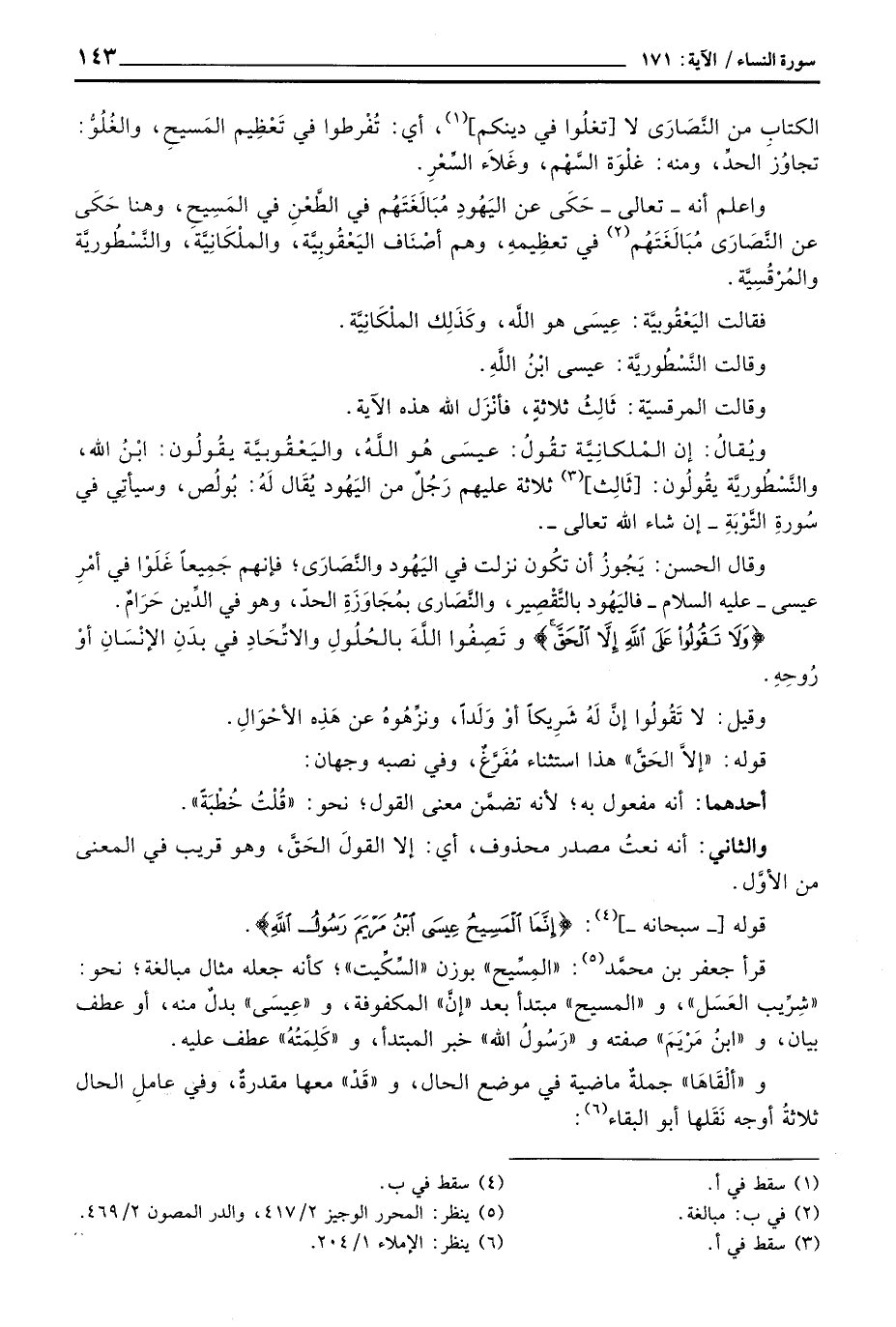 الكتابِ من النَّصَارَى لا [تغلُوا في دينكم] ، اي: تُفْرطوا في تَعْظِيم المَسيحِ، والغُلُوُّ: تجاوُز الحدِّ، ومنه: غلْوَة السَّهْم، وغَلاَء السِّعْرِ.