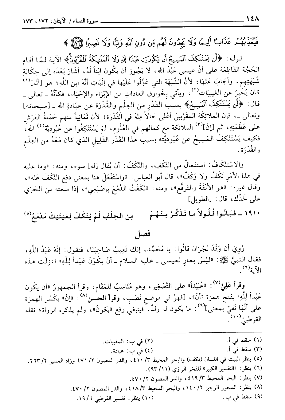 قوله: {لَّن يَسْتَنكِفَ المسيح أَن يَكُونَ عَبْداً للَّهِ وَلاَ الملاائكة المقربون} الآية لمَّا أقام الحُجَّة القَاطِعَة على أنَّ عيسى عَبْدُ الله، لا يَجُوز أن يكُون ابْناً لَهُ، أشَارَ بَعْدَه إلى حِكَايَةِ شُبْهَتِهِم، وأجَابَ عَنْهَا؛ لأنَّ الشُّبْهَة التي عَوَّلُوا عَلَيْها في إثْبَاتِ أنَّهُ ابن اللَّهِ؛ هو [أنَّه] كان يُخْبِرُ عن الغيبيّات، ويأتي بِخَوارقِ العاداتِ من الإبْرَاء والإحْيَاء، فكأنَّهُ - تعالى - قال: {لَّن يَسْتَنكِفَ المسيح} بسبب القَدْرِ من العِلْم والقُدْرَة عن عِبَادةِ الله -[سبحانه] وتعالى -، فإن الملائِكَة المقَرَّبينَ أعْلَى حَالاً مِنْهُ في اَلقُدْرَة؛ لأن ثَمَانِيةً منهم حَمَلةُ العَرْشِ على عَظَمَتِهِ، ثم [إنّ] الملائكة مع كمالهم في العُلُوم، لمْ يَسْتَنْكِفُوا عن عُبُودِيَّة الله، فكيف يَسْتَنْكِفُ المَسِيحُ عن عُبُوديَّته بسبب هذا القَدْرِ القَلِيلِ الذي كان مَعَهُ من العِلْمِ والقُدْرَة.
