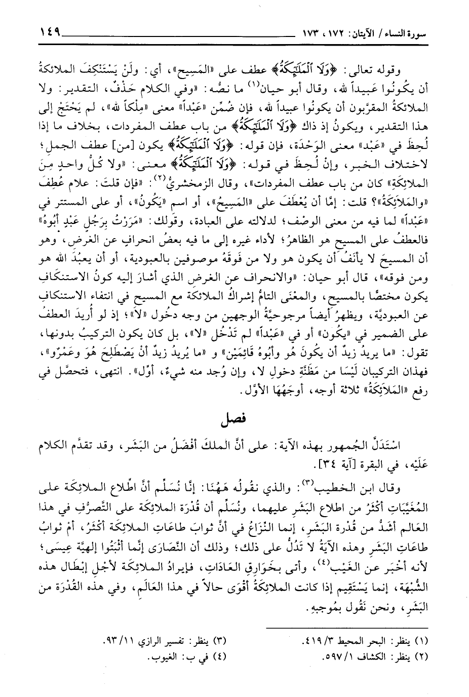 وقال ابن الخطيب: والذي نقُولُه هَهُنَا: إنَّا نُسَلِّم أنَّ اطِّلاع الملائِكَة على المُغَيِّبَاتِ أكْثَرُ من اطلاع البَشَرِ عليهما، ونُسَلِّم أن قُدْرَة الملائِكَة على التَّصرُّفِ في هذا العَالم أشَدُّ من قُدْرة البَشَر، إنما النِّزاعُ في أنَّ ثوابَ طاعَاتِ الملائِكَة أكْثَرُ، أمْ ثوابُ طاعَاتِ البَشَرِ وهذه الآيَةُ لا تَدُلُّ على ذلك؛ وذلك أن النَّصَارَى إنَّما أثْبَتُوا إلهيَّة عِيسَى؛ لأنه أخْبَر عن الغَيْب، وأتى بخَوَارِقِ العَادَاتِ، فإيرادُ الملائِكَة لأجْلِ إبْطَال هذه الشُّبْهَة، إنما يَسْتَقِيم إذا كانت الملائِكَةُ أقْوَى حالاً في هذا العَالَمِ، وفي هذه القُدْرَة من البَشَرِ، ونحن نَقُول بمُوجبهِ.