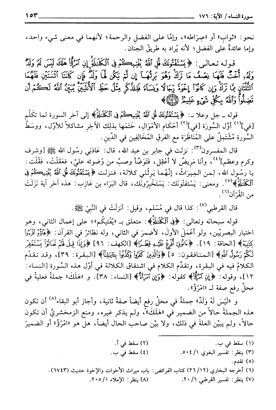 قوله سبحانه وتعالى: {فِي الكلالة} : متعلق ب «يُفْتيكُم» ؛ على إعمال الثاني، وهو اختيار البصريّين، ولو أعْمَلَ الأولَ، لأضمرَ في الثاني، وله نظائرُ في القرآن: {هَآؤُمُ اقرؤا كِتَابيَهْ} [الحاقة: 19] . {آتوني أُفْرِغْ عَلَيْهِ قِطْراً} [الكهف: 96] {وَإِذَا قِيلَ لَهُمْ تَعَالَوْاْ يَسْتَغْفِرْ لَكُمْ رَسُولُ الله} [المنافقون: 5] {والذين كَفَرواْ وَكَذَّبُواْ بِآيَاتِنَآ} [البقرة: 39] ، وقد تقدَّم الكلامُ فيه في البقرة، وتقدَّم الكلام في اشتقاق الكلالة في أوَّل هذه السُّورة [النساء: 12] ، وقوله: {إِن امرؤ} كقوله: {وَإِنِ امرأة} [النساء: 128] . و «هَلَكَ» جملةٌ فعليةٌ في محلِّ رفع صفة ل «امْرُؤٌ» .