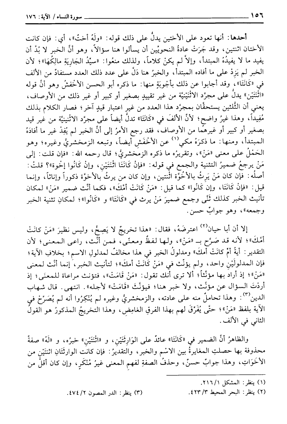 أحدهما: أنها تعود على الأختين يدلُّ على ذلك قوله: «ولَهُ أختٌ» ، أي: فإن كانت الأختان اثنتين، وقد جَرَتْ عادةُ النحويّين أن يسألوا هنا سؤالاً، وهو أنَّ الخبر لا بُدَّ أن يفيد ما لا يفيدُهُ المبتدأ، وإلاَّ لم يكنْ كلاماً، ولذلك منعُوا: «سيِّدُ الجَارِيَةِ مالِكُهَا» ؛ لأن الخبر لم يَزِدْ على ما أفاده المبتدأ، والخبرُ هنا دَلَّ على عدد ذلك العدد مستفادٌ من الألف في «كَانَتَا» ، وقد أجابوا عن ذلك بأجْوبَةٍ منها: ما ذكره أبو الحسن الأخْفشُ وهو أنَّ قوله «اثْنَتَيْن» يدلُّ على مجرَّد الاثْنَيْنيَّة من غير تقييدٍ بصغير أو كبير أو غير ذلك من الأوصاف، يعني أن الثُّلثين يستحقَّان بمجرَّد هذا العدد من غير اعتبار قيدٍ آخر؛ فصار الكلام بذلك مُفِيداً، وهذا غيرُ واضحٍ؛ لأنَّ الألفَ في «كَانَتَا» تدلُّ أيضاً على مجرَّد الاثْنينيَّة من غير قيد بصغير أو كبير أو غيرهما من الأوصاف، فقد رجع الأمرُ إلى أنَّ الخبر لم يُفِدْ غير ما أفادَهُ المبتدأ، ومنها: ما ذكرَهُ مكي عن الأخْفَشِ أيضاً، وتبعه الزمخشريُّ وغيره؛ وهو الحَمْلُ على معنى «مَنْ» ، وتقريرُه ما ذكره الزمخشريُّ؛ قال رَحِمَهُ اللَّهُ: «فإن قلت: إلى مَنْ يرجعُ ضميرُ التثنية والجمع في قوله:» فإنْ كَانَتَا اثْنَتَيْنِ، وإنْ كَانُوا إخْوة «؟ قلتُ: أصلُه: فإن كان مَنْ يَرِثُ بالأخوَّة اثْنتين، وإن كان من يرثُ بالأخوَّة ذكوراً وإناثاً، وإنما قيل:» فإنْ كَانَتَا، وإن كَانُوا «كما قيل:» مَنْ كَانَتْ أمَّكَ «، فكما أنَّث ضمير» مَنْ «لمكان تأنيث الخبر كذلك ثَنَّى وجمع ضميرَ مَنْ يرث في» كَانَتَا «و» كَانُوا «؛ لمكانِ تثنية الخبر وجمعه» ، وهو جوابٌ حسن.