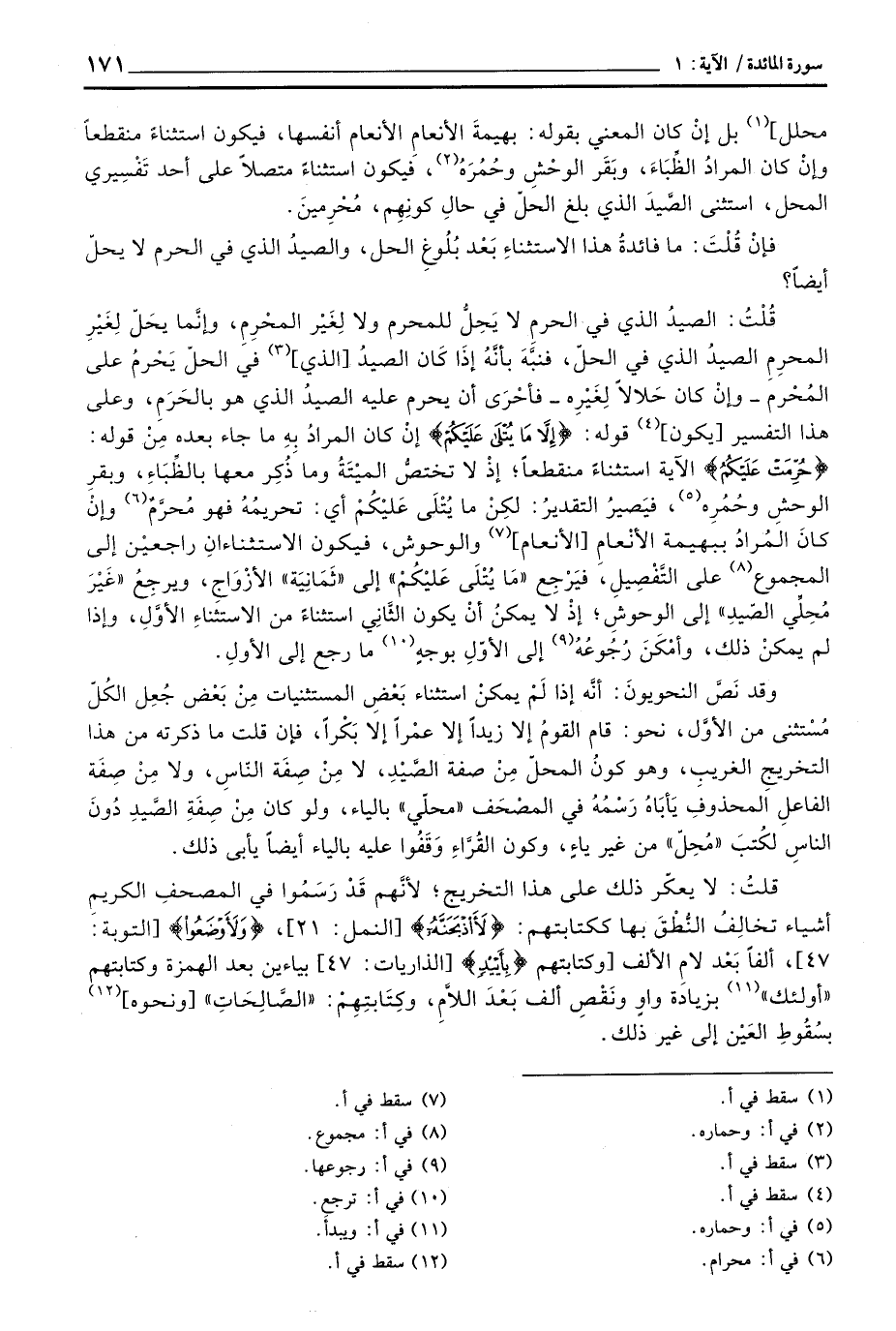 وقد نَصَّ النحويونَ: أنَّه إذا لَمْ يمكنْ استثناء بَعْضِ المستثنيات مِنْ بَعْض جُعِل الكُلّ مُسْتثنى من الأوَّل، نحو: قام القومُ إلا زيداً إلا عمْراً إلا بَكْراً، فإن قلت ما ذكرته من هذا التخريجِ الغريبِ، وهو كونُ المحلّ مِنْ صفة الصَّيْدِ، لا مِنْ صِفَة النّاسِ، ولا مِنْ صِفَة الفاعلِ المحذوفِ يَأبَاهُ رَسْمُهُ في المصْحَف «محلّي» بالياء، ولو كان مِنْ صِفَةِ الصَّيدِ دُونَ الناسِ لكُتبَ «مُحِلّ» من غير ياءٍ، وكون القُرَّاءِ وَقَفُوا عليه بالياء أيضاً يأبى ذلك.