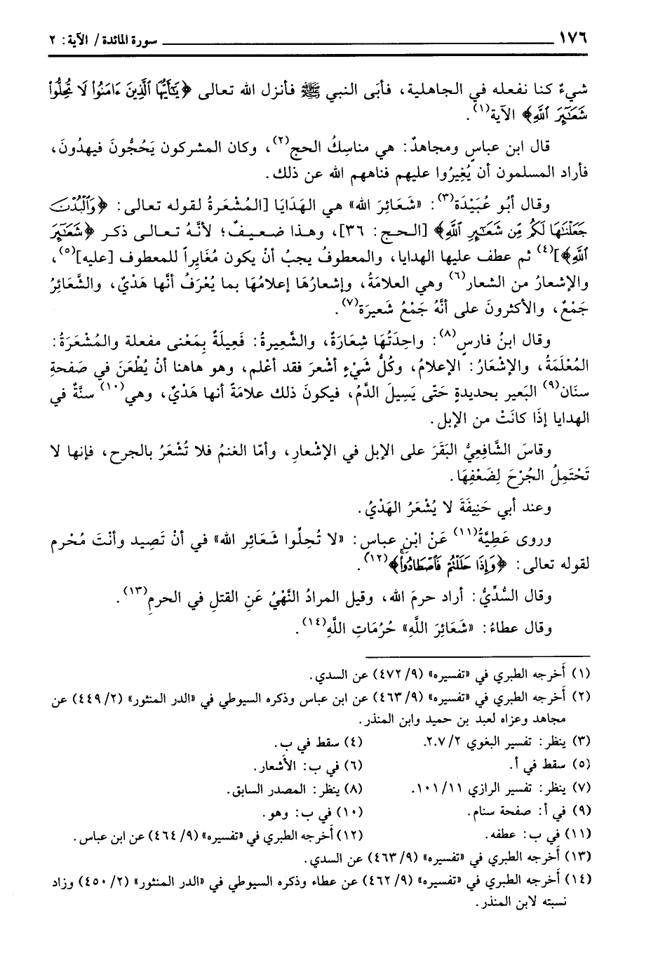 قال ابن عباسٍ ومجاهدٌ: هي مناسِكُ الحج، وكان المشركون يَحُجُّونَ فيهدُونَ، فأراد المسلمون أن يُغِيرُوا عليهم فناههم الله عن ذلك.