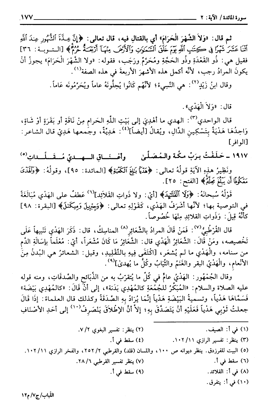 قَوْلُهُ سُبحانَهُ: {وَلاَ القلاائد} [أيْ: ولا ذَواتِ القَلاَئِد] عَطفٌ على الهَدْي مُبَالَغَةً في التوصية بها؛ لأنَّها أشَرَفُ الهَدْي، كَقَوْلِهِ تعالى: {وَجِبْرِيلَ وَمِيكَالَ} [البقرة: 98] كأنَّهُ قِيلَ: وَذَواتِ القَلاَئِد] كأنَّهُ قِيلَ: وَذَواتِ القلائِدِ مِنْهَا خُصُوصاً.