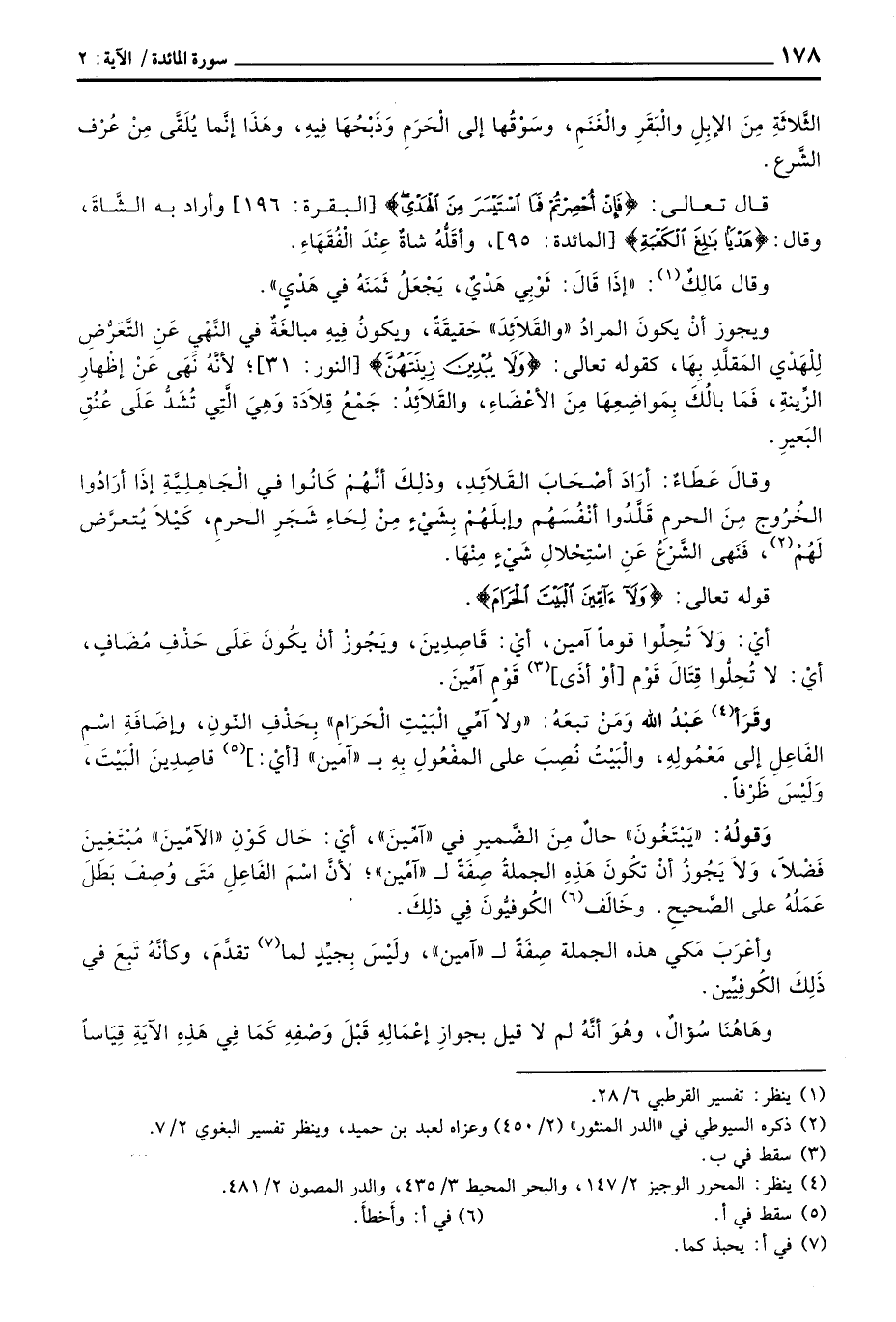 وقَرَأ عَبْدُ الله وَمَنْ تبعَهُ: «ولا آمِّي الْبَيْتِ الْحَرَامِ» بِحَذْفِ النّونِ، وإضَافَةِ اسْمِ الفَاعِلِ إلى مَعْمُولِهِ، والْبَيْتُ نُصِبَ على المفْعُولِ بِهِ ب «آمين» [أيْ:] قاصِدِينَ الْبَيْتَ، وَلَيْسَ ظَرْفاً.