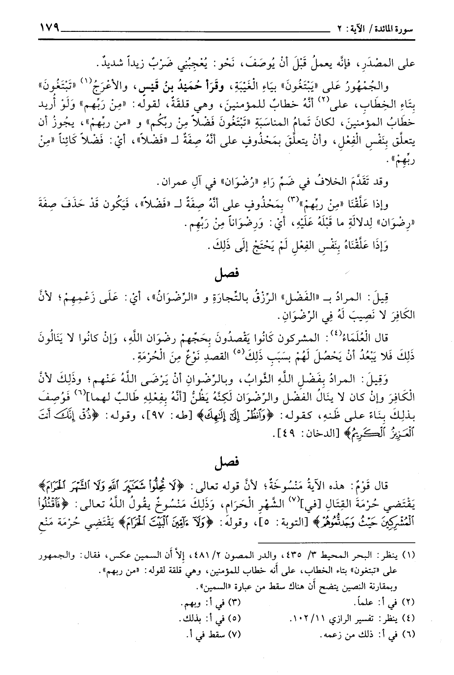 والجُمْهُورُ عَلى «يَبْتَغُونَ» بيَاءِ الْغَيْبَةِ، وقَرَأ حُمَيْدُ بنُ قَيْسٍ، والأعْرَجُ «تَبْتَغُونَ» بِتَاءِ الخِطَابِ، على أنَّه خطابٌ للمؤمنينَ، وهي قلقَةٌ، لقوله: «مِنْ ربِّهمْ» وَلَوْ أُريد خطَابُ المؤمنينَ، لكانَ تَمامُ المناسَبَةِ {تَبْتَغُون فَضْلاً مِنْ ربِّكُم} و «من ربِّهمْ» ، يجُوزُ أن يتعلَّقَ بِنَفْسِ الْفَعْلِ، وأنْ يتعلَّقَ بمَحْذُوفٍ على أنَّهُ صِفَةٌ ل «فَضْلاً» ، أيْ: فَضْلاً كَائِناً «مِنْ ربِّهِمْ» .