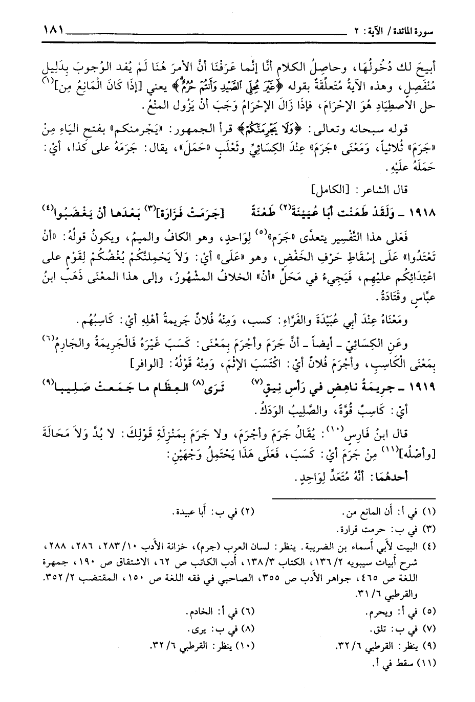 قوله سبحانه وتعالى: {وَلاَ يَجْرِمَنَّكُمْ} قرأ الجمهور: «يَجْرمنكم» بفتحِ اليَاءِ مِنْ «جَرَمَ» ثُلاثياً، وَمَعْنَى «جَرَمَ» عِنْدَ الكِسَائِيِّ وثَعْلَبٍ «حَمَلَ» ، يقال: جَرَمَهُ على كَذا، أيْ: حَمَلَهُ علَيْهِ.